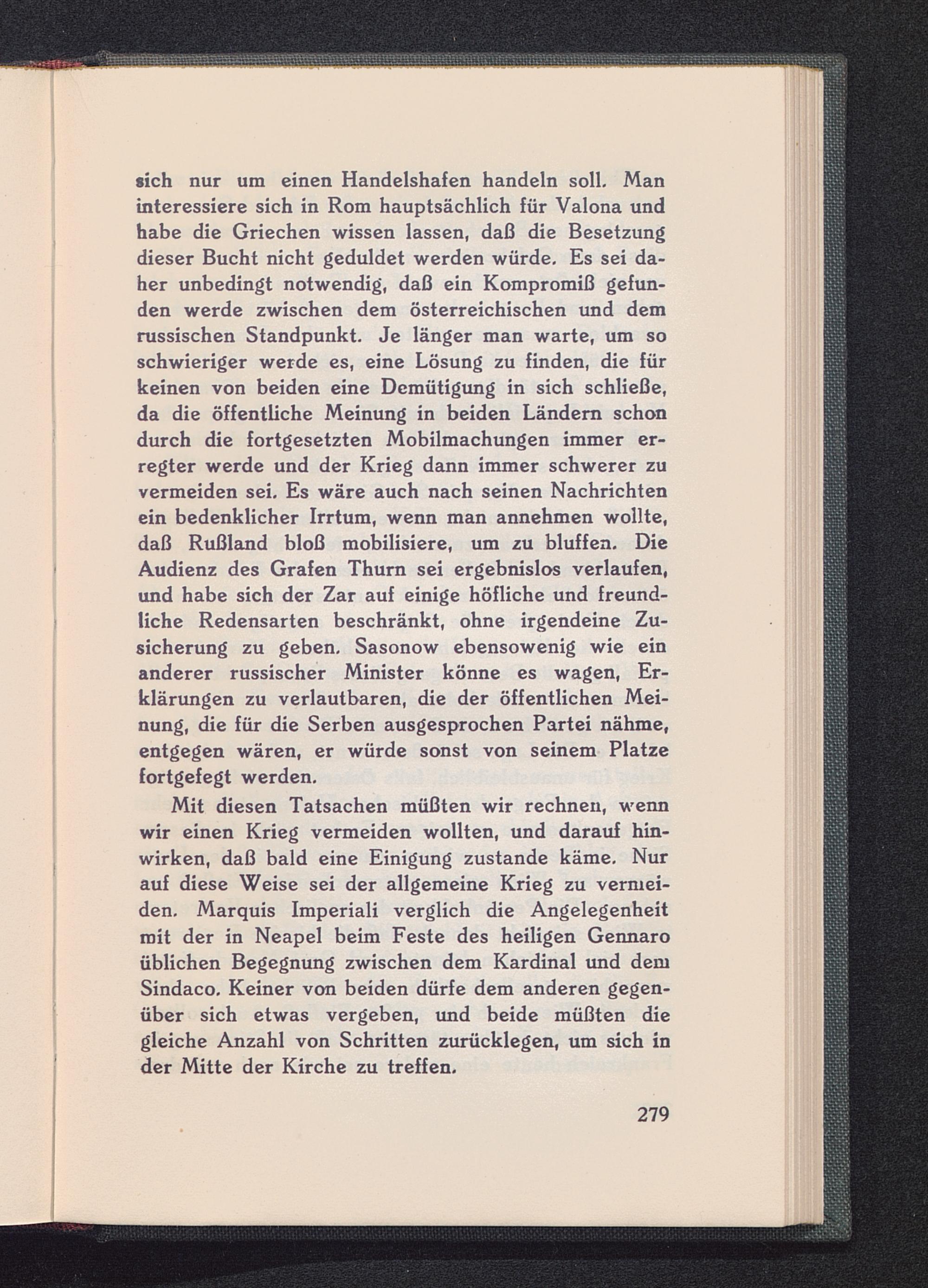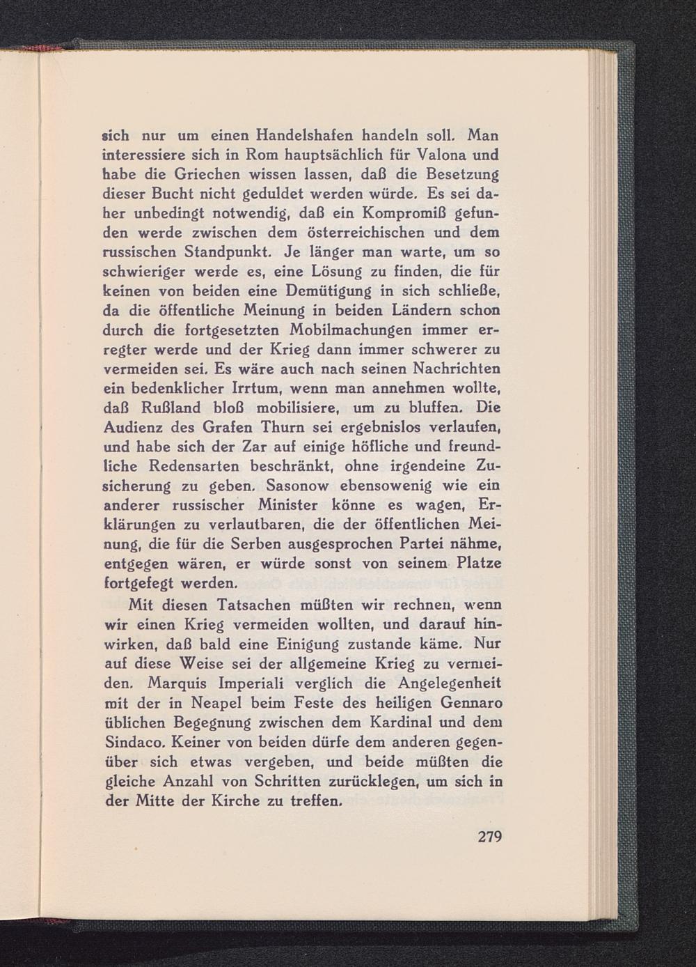 Mit diesen Tatsachen müßten wir rechnen, wennwir einen Krieg vermeiden wollten, und darauf hin-wirken, daß bald eine Einigung zustande käme. Nurauf diese Weise sei der allgemeine Krieg zu vermei-den. Marquis Imperiali verglich die Angelegenheitmit der in Neapel beim Feste des heiligen Gennaroüblichen Begegnung zwischen dem Kardinal und demSindaco . Keiner von beiden dürfe dem anderen gegen-über sich etwas vergeben, und beide müßten diegleiche Anzahl von Schritten zurücklegen, um sich inder Mitte der Kirche zu treffen.