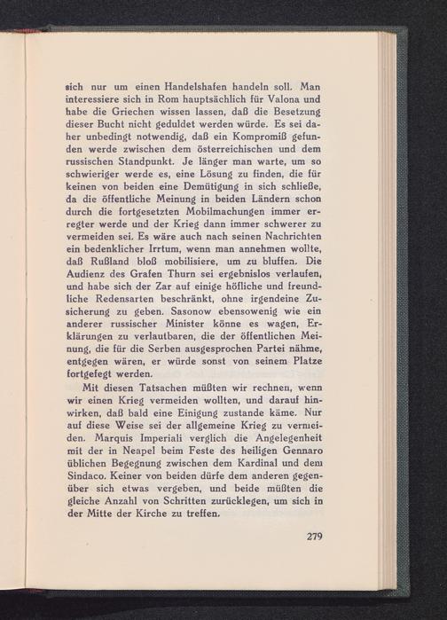 •ich nur um einen Handelshafen handeln soll. Maninteressiere sich in Rom hauptsächlich für Valona undhabe die Griechen wissen lassen, daß die Besetzungdieser Bucht nicht geduldet werden würde. Es sei da-her unbedingt notwendig, daß ein Kompromiß gefun-den werde zwischen dem österreichischen und demrussischen Standpunkt. Je länger man warte, um soschwieriger werde es, eine Lösung zu finden, die fürkeinen von beiden eine Demütigung in sich schließe,da die öffentliche Meinung in beiden Ländern schondurch die fortgesetzten Mobilmachungen immer er-regter werde und der Krieg dann immer schwerer zuvermeiden sei. Es wäre auch nach seinen Nachrichtenein bedenklicher Irrtum, wenn man annehmen wollte,daß Rußland bloß mobilisiere, um zu bluffen. DieAudienz des Grafen Thurn sei ergebnislos verlaufen,und habe sich der Zar auf einige höfliche und freund-liche Redensarten beschränkt, ohne irgendeine Zu-sicherung zu geben. Sasonow ebensowenig wie einanderer russischer Minister könne es wagen, Er-klärungen zu verlautbaren, die der öffentlichen Mei-nung, die für die Serben ausgesprochen Partei nähme,entgegen wären, er würde sonst von seinem Platzefortgefegt werden.