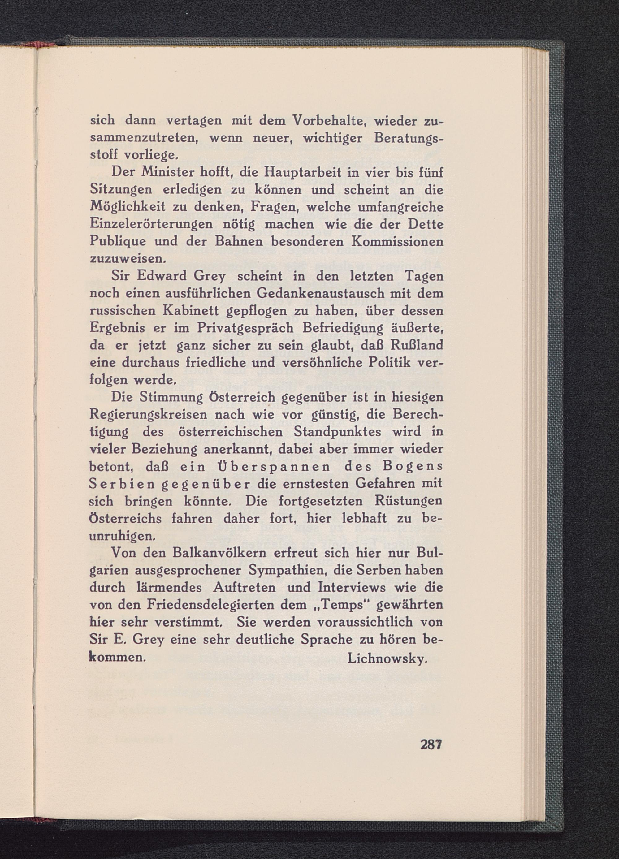 Sir Edward Grey scheint in den letzten Tagennoch einen ausführlichen Gedankenaustausch mit demrussischen Kabinett gepflogen zu haben, über dessenErgebnis er im Privatgespräch Befriedigung äußerte,da er jetzt ganz sicher zu sein glaubt, daß Rußland eine durchaus friedliche und versöhnliche Politik ver-folgen werde.