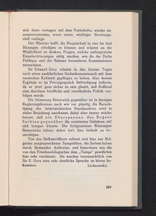Von den Balkanvölkern erfreut sich hier nur Bul-garien ausgesprochener Sympathien, die Serben habendurch lärmendes Auftreten und Interviews wie dievon den Friedensdelegierten dem „Temps" gewährtenhier sehr verstimmt. Sie werden voraussichtlich vonSir E. Grey eine sehr deutliche Sprache zu hören be-kommen. Lichnowsky.