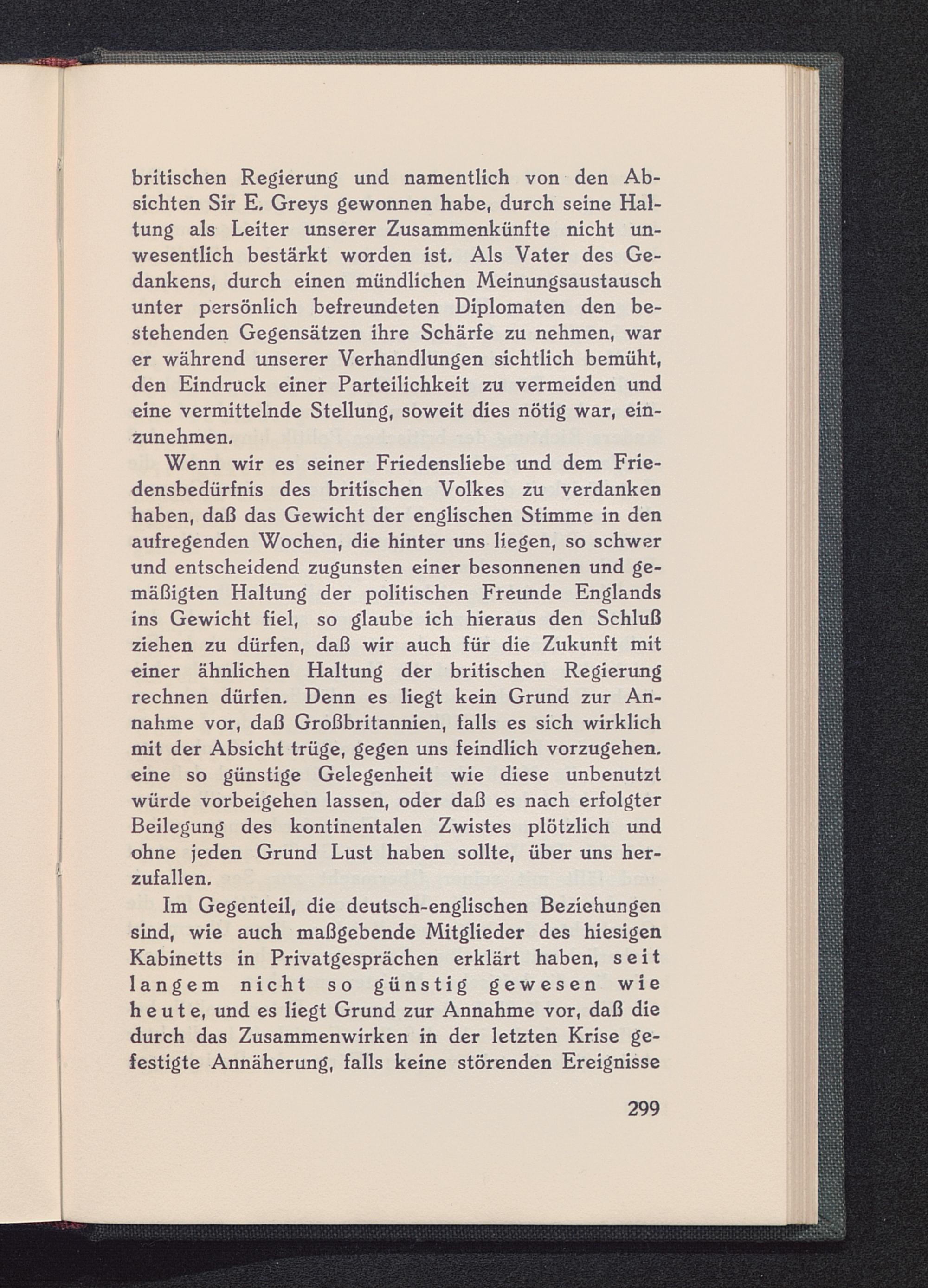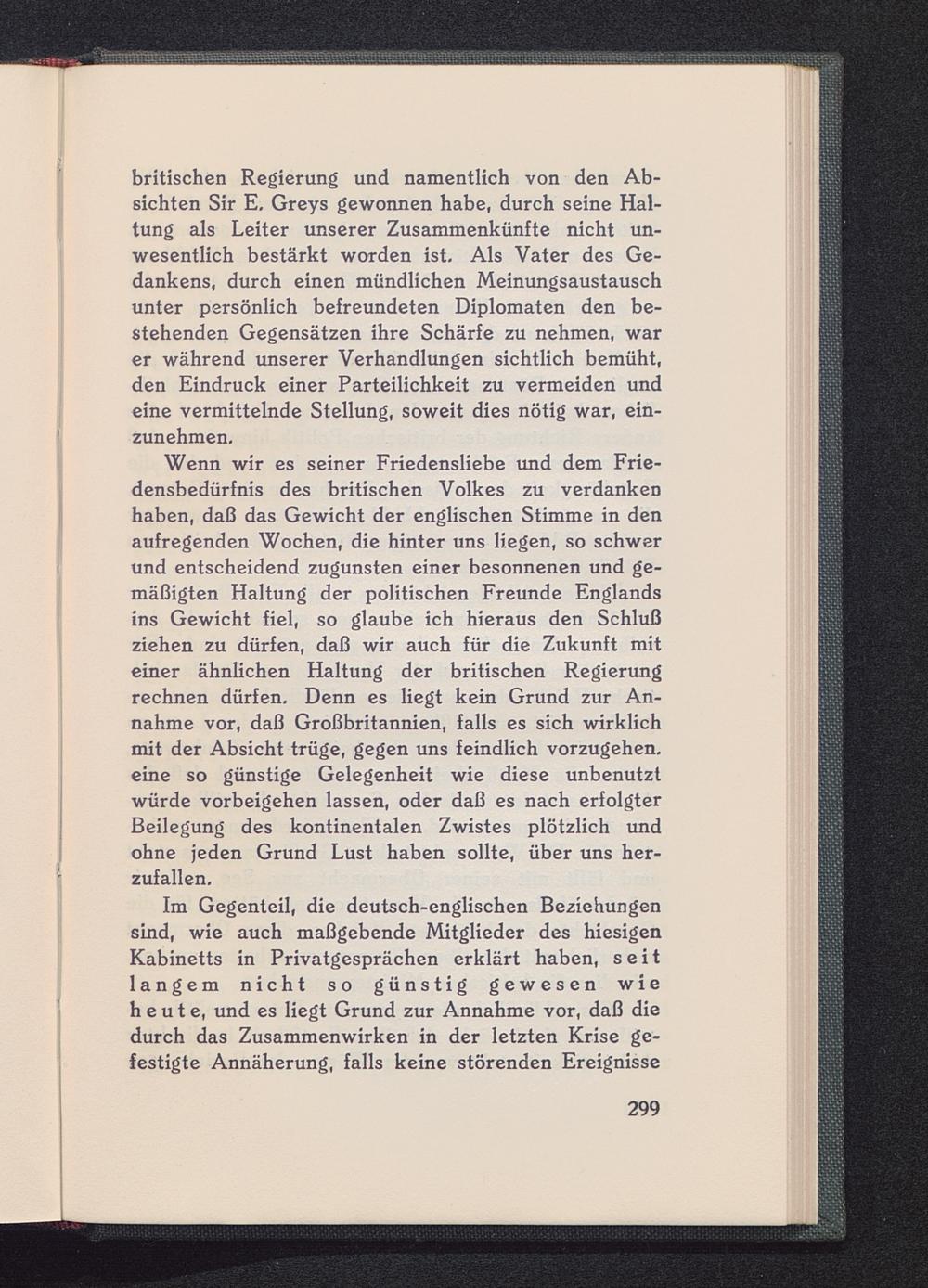 britischen Regierung und namentlich von den Ab-sichten Sir E. Greys gewonnen habe, durch seine Hal-tung als Leiter unserer Zusammenkünfte nicht un-wesentlich bestärkt worden ist. Als Vater des Ge-dankens, durch einen mündlichen Meinungsaustauschunter persönlich befreundeten Diplomaten den be-stehenden Gegensätzen ihre Schärfe zu nehmen, warer während unserer Verhandlungen sichtlich bemüht,den Eindruck einer Parteilichkeit zu vermeiden undeine vermittelnde Stellung, soweit dies nötig war, ein-zunehmen.