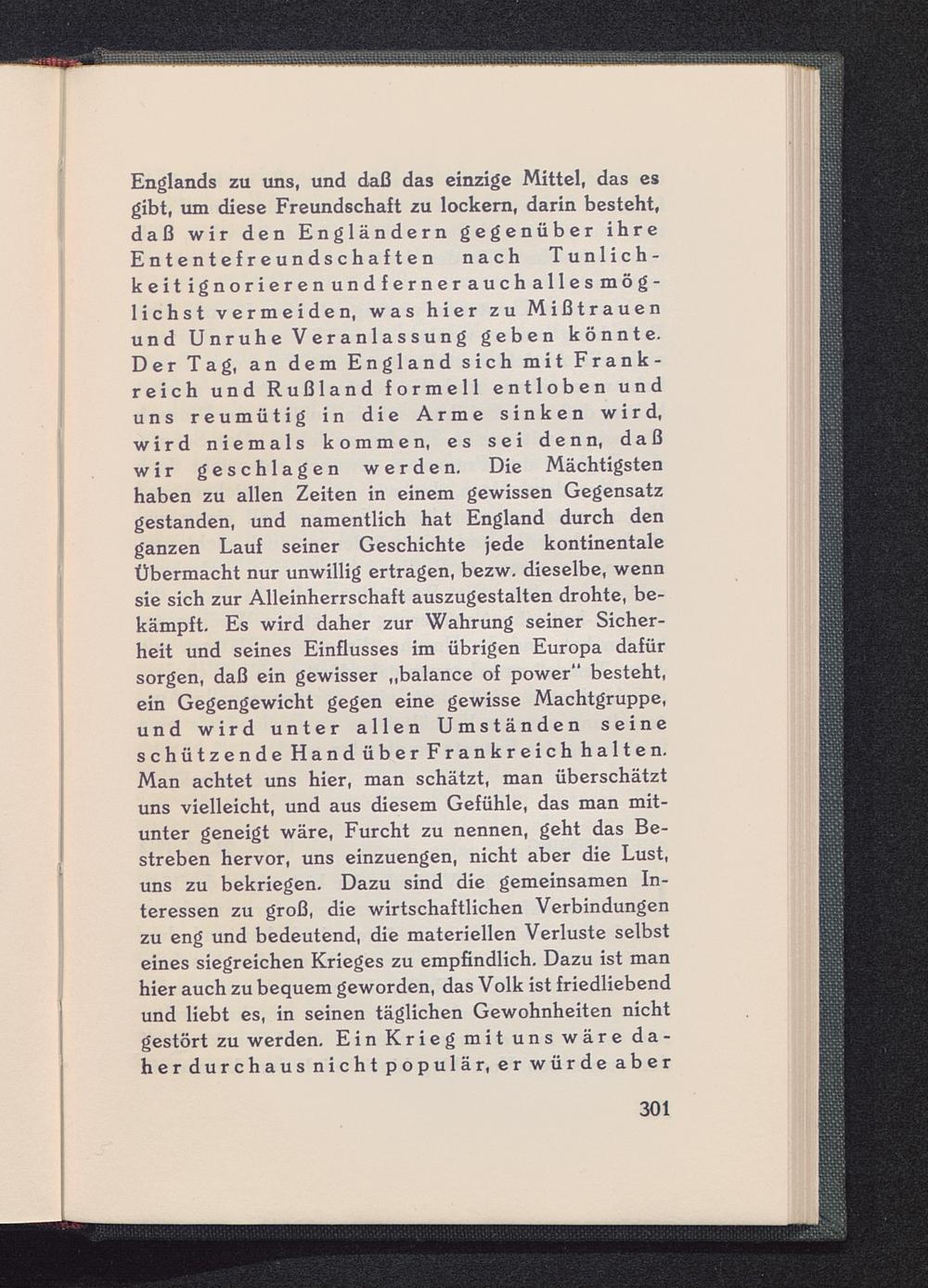 Englands zu uns, und daß das einzige Mittel, das esgibt, um diese Freundschaft zu lockern, darin besteht,daß wir den Engländern gegenüber ihreEntentefreundschaften nach Tunlich-keitignorierenundfernerauchallesmög-lichst vermeiden, was hier zu Mißtrauenund Unruhe Veranlassung geben könnte.Der Tag, an dem England sich mit Frank-reich und Rußland formell entloben unduns reumütig in die Arme sinken wird,wird niemals kommen, es sei denn, daßwir geschlagen werden. Die Mächtigstenhaben zu allen Zeiten in einem gewissen Gegensatzgestanden, und namentlich hat England durch denganzen Lauf seiner Geschichte jede kontinentaleÜbermacht nur unwillig ertragen, bezw. dieselbe, wennsie sich zur Alleinherrschaft auszugestalten drohte, be-kämpft. Es wird daher zur Wahrung seiner Sicher-heit und seines Einflusses im übrigen Europa dafürsorgen, daß ein gewisser „balance of power" besteht,ein Gegengewicht gegen eine gewisse Machtgruppe,und wird unter allen Umständen seineschützende Hand über Frankreich halten.Man achtet uns hier, man schätzt, man überschätztuns vielleicht, und aus diesem Gefühle, das man mit-unter geneigt wäre, Furcht zu nennen, geht das Be-streben hervor, uns einzuengen, nicht aber die Lust,uns zu bekriegen. Dazu sind die gemeinsamen In-teressen zu groß, die wirtschaftlichen Verbindungenzu eng und bedeutend, die materiellen Verluste selbsteines siegreichen Krieges zu empfindlich. Dazu ist manhier auch zu bequem geworden, das Volk ist friedliebendund liebt es, in seinen täglichen Gewohnheiten nichtgestört zu werden. Ein Krieg mit uns wäre da-her durchaus nicht populär, er würde aber