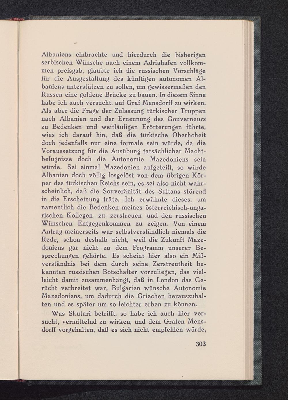 Albaniens einbrachte und hierdurch die bisherigenserbischen Wünsche nach einem Adriahafen vollkom-men preisgab, glaubte ich die russischen Vorschlägefür die Ausgestaltung des künftigen autonomen Al-baniens unterstützen zu sollen, um gewissermaßen denRussen eine goldene Brücke zu bauen. In diesem Sinnehabe ich auch versucht, auf Graf Mensdorff zu wirken.Als aber die Frage der Zulassung türkischer Truppennach Albanien und der Ernennung des Gouverneurszu Bedenken und weitläufigen Erörterungen führte,wies ich darauf hin, daß die türkische Oberhoheitdoch jedenfalls nur eine formale sein würde, da dieVoraussetzung für die Ausübung tatsächlicher Macht-befugnisse doch die Autonomie Mazedoniens seinwürde. Sei einmal Mazedonien aufgeteilt, so würdeAlbanien doch völlig losgelöst von dem übrigen Kör-per des türkischen Reichs sein, es sei also nicht wahr-scheinlich, daß die Souveränität des Sultans störendin die Erscheinung träte. Ich erwähnte dieses, umnamentlich die Bedenken meines österreichisch-unga-rischen Kollegen zu zerstreuen und den russischen Wünschen Entgegenkommen zu zeigen. Von einemAntrag meinerseits war selbstverständlich niemals dieRede, schon deshalb nicht, weil die Zukunft Maze-doniens gar nicht zu dem Programm unserer Be-sprechungen gehörte. Es scheint hier also ein Miß-verständnis bei dem durch seine Zerstreutheit be-kannten russischen Botschafter vorzuliegen, das viel-leicht damit zusammenhängt, daß in London das Ge-rücht verbreitet war, Bulgarien wünsche AutonomieMazedoniens , um dadurch die Griechen herauszuhal-ten und es später um so leichter erben zu können.