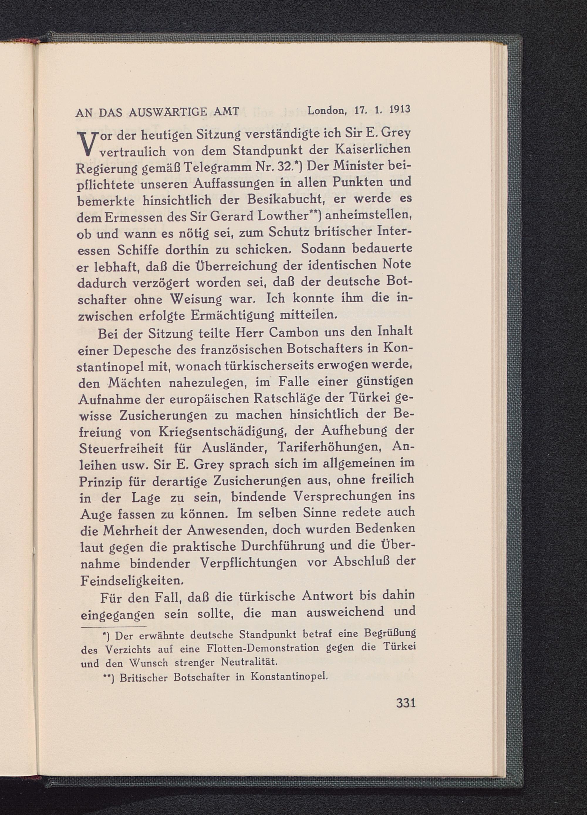 *) Der erwähnte deutsche Standpunkt betraf eine Begrüßungdes Verzichts auf eine Flotten-Demonstration gegen die Türkei und den Wunsch strenger Neutralität.