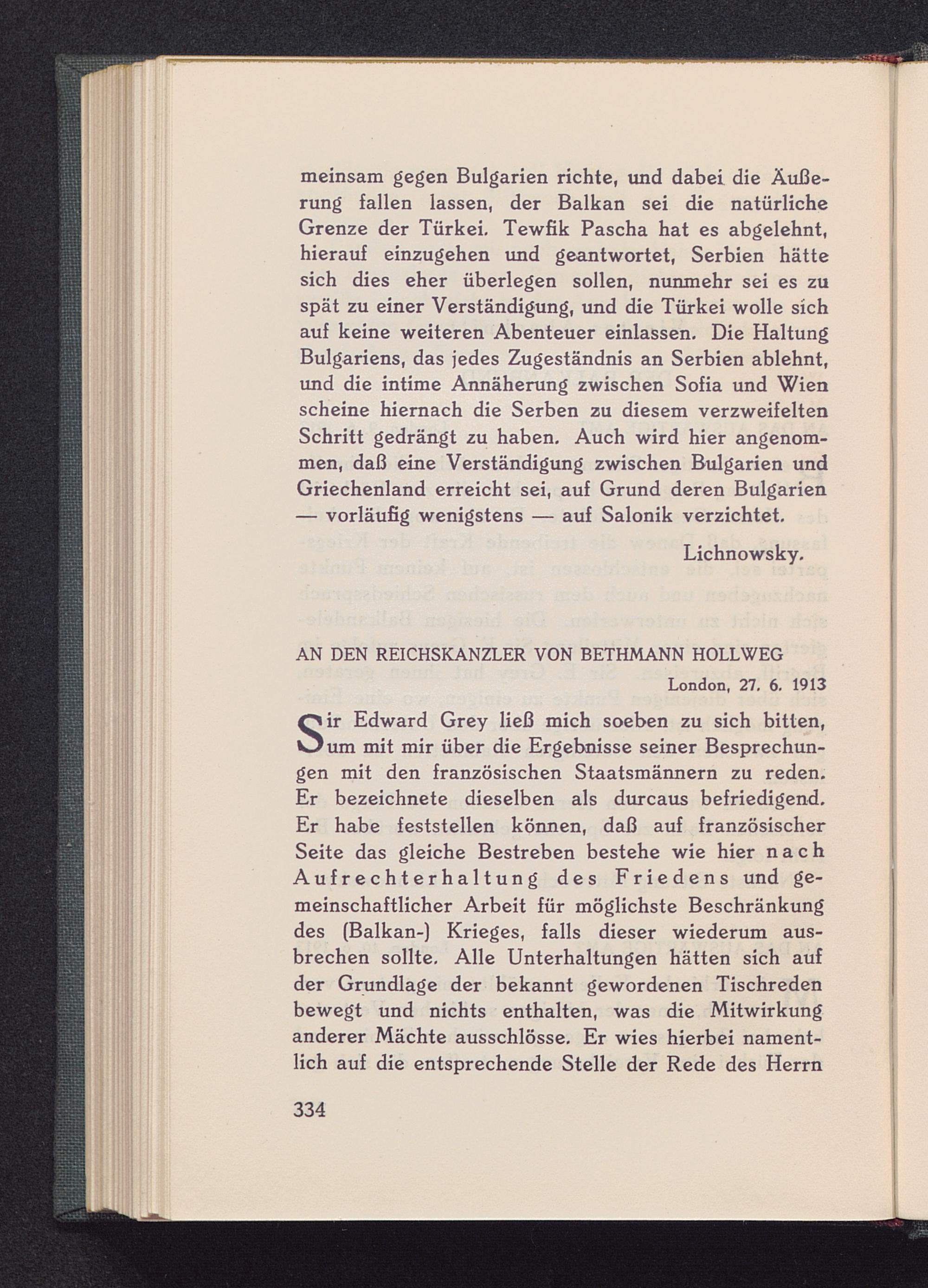 S ir Edward Grey ließ mich soeben zu sich bitten,um mit mir über die Ergebnisse seiner Besprechun-gen mit den französischen Staatsmännern zu reden.Er bezeichnete dieselben als durcaus befriedigend.Er habe feststellen können, daß auf französischerSeite das gleiche Bestreben bestehe wie hier nachAufrechterhaltung des Friedens und ge-meinschaftlicher Arbeit für möglichste Beschränkungdes (Balkan- ) Krieges, falls dieser wiederum aus-brechen sollte. Alle Unterhaltungen hätten sich aufder Grundlage der bekannt gewordenen Tischredenbewegt und nichts enthalten, was die Mitwirkunganderer Mächte ausschlösse. Er wies hierbei nament-lich auf die entsprechende Stelle der Rede des Herrn