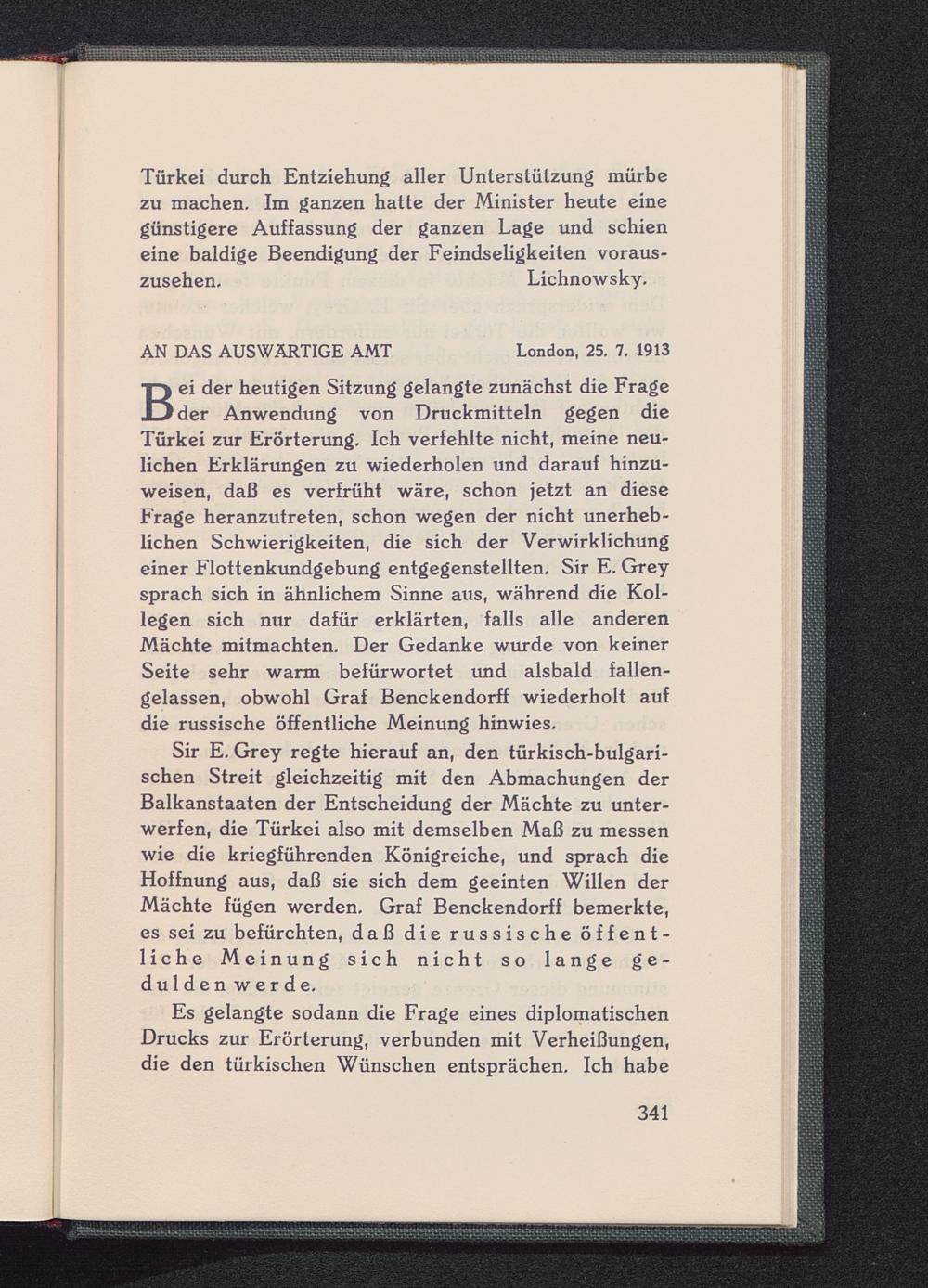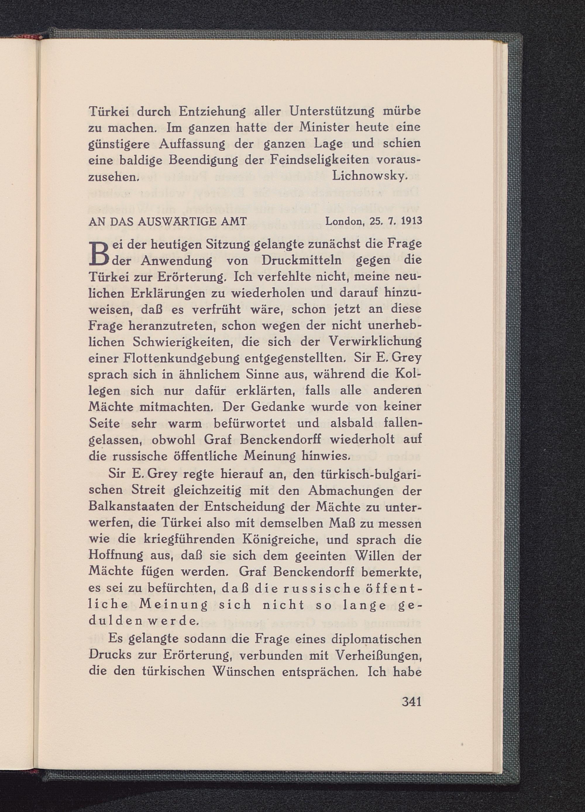 B ei der heutigen Sitzung gelangte zunächst die Frageder Anwendung von Druckmitteln gegen dieTürkei zur Erörterung. Ich verfehlte nicht, meine neu-lichen Erklärungen zu wiederholen und darauf hinzu-weisen, daß es verfrüht wäre, schon jetzt an dieseFrage heranzutreten, schon wegen der nicht unerheb-lichen Schwierigkeiten, die sich der Verwirklichungeiner Flottenkundgebung entgegenstellten. Sir E. Greysprach sich in ähnlichem Sinne aus, während die Kol-legen sich nur dafür erklärten, falls alle anderenMächte mitmachten. Der Gedanke wurde von keinerSeite sehr warm befürwortet und alsbald fallen-gelassen, obwohl Graf Benckendorff wiederholt aufdie russische öffentliche Meinung hinwies.