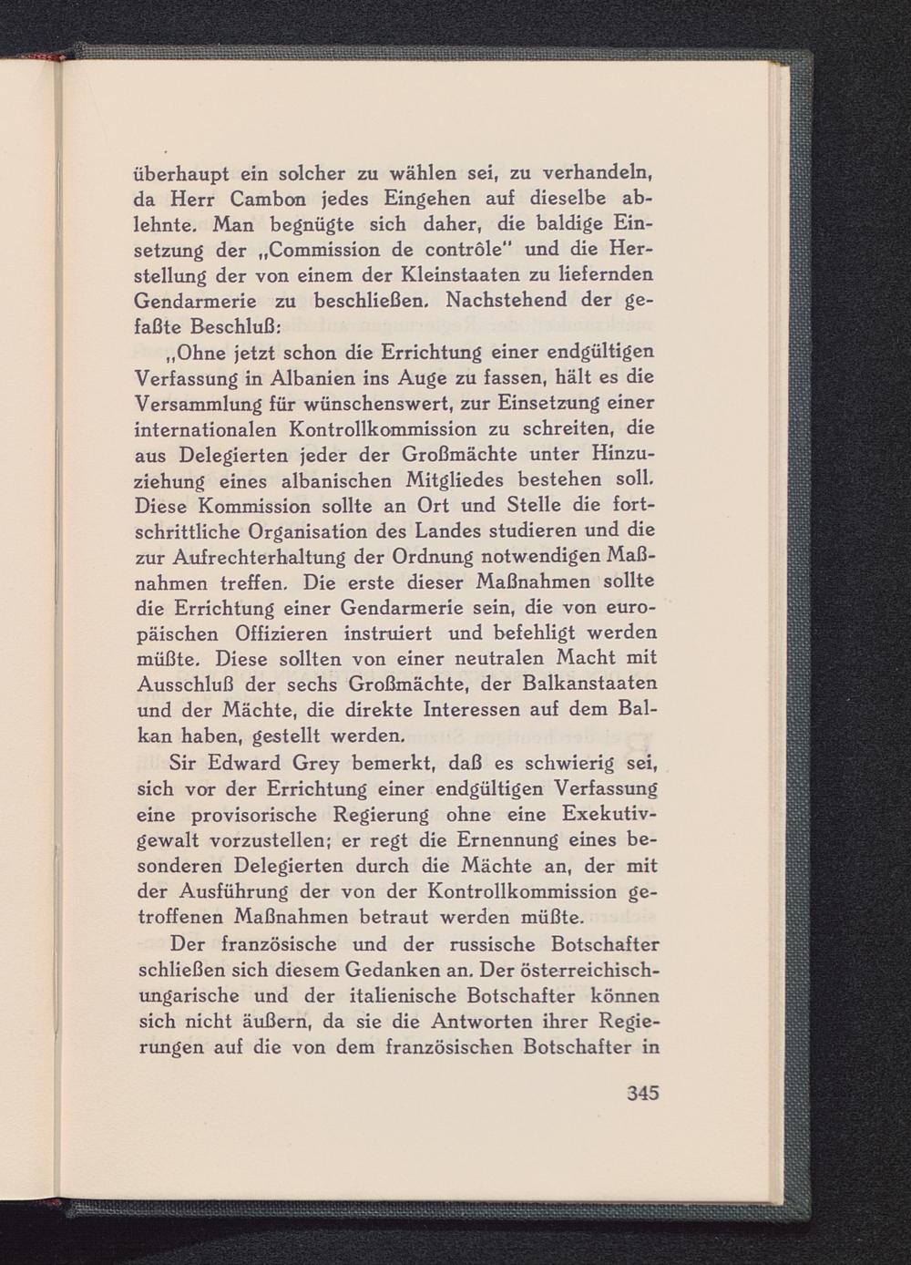 „Ohne jetzt schon die Errichtung einer endgültigenVerfassung in Albanien ins Auge zu fassen, hält es dieVersammlung für wünschenswert, zur Einsetzung einerinternationalen Kontrollkommission zu schreiten, dieaus Delegierten jeder der Großmächte unter Hinzu-ziehung eines albanischen Mitgliedes bestehen soll.Diese Kommission sollte an Ort und Stelle die fort-schrittliche Organisation des Landes studieren und diezur Aufrechterhaltung der Ordnung notwendigen Maß-nahmen treffen. Die erste dieser Maßnahmen solltedie Errichtung einer Gendarmerie sein, die von euro-päischen Offizieren instruiert und befehligt werdenmüßte. Diese sollten von einer neutralen Macht mitAusschluß der sechs Großmächte, der Balkanstaatenund der Mächte, die direkte Interessen auf dem Bal-kan haben, gestellt werden.