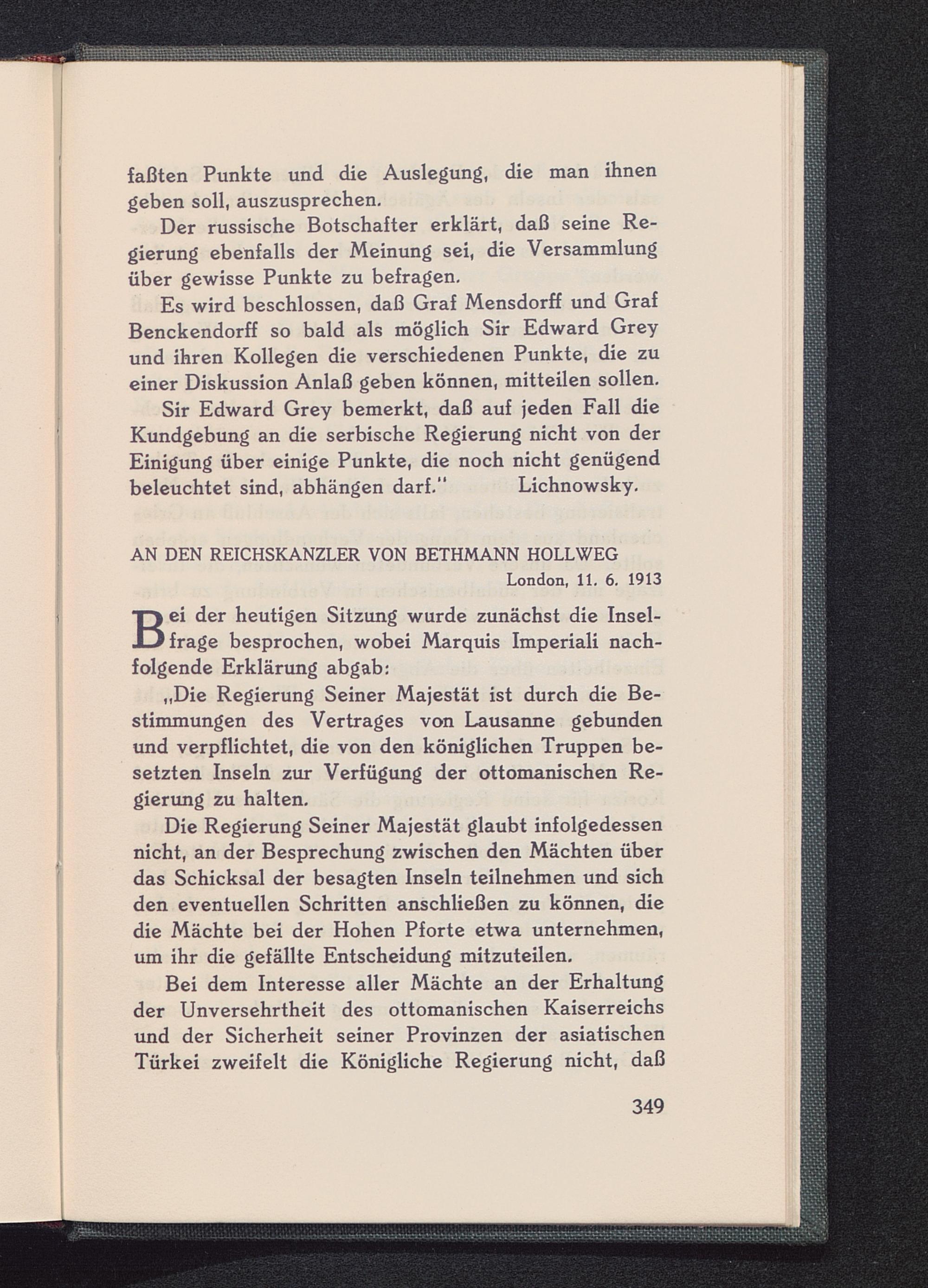 Es wird beschlossen, daß Graf Mensdorff und GrafBenckendorff so bald als möglich Sir Edward Grey und ihren Kollegen die verschiedenen Punkte, die zueiner Diskussion Anlaß geben können, mitteilen sollen.