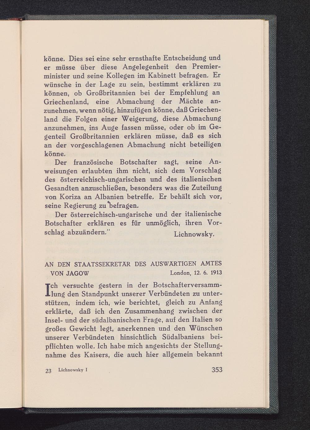 Der österreichisch-ungarische und der italienischeBotschafter erklären es für unmöglich, ihren Vor-schlag abzuändern." Lichnowsky.