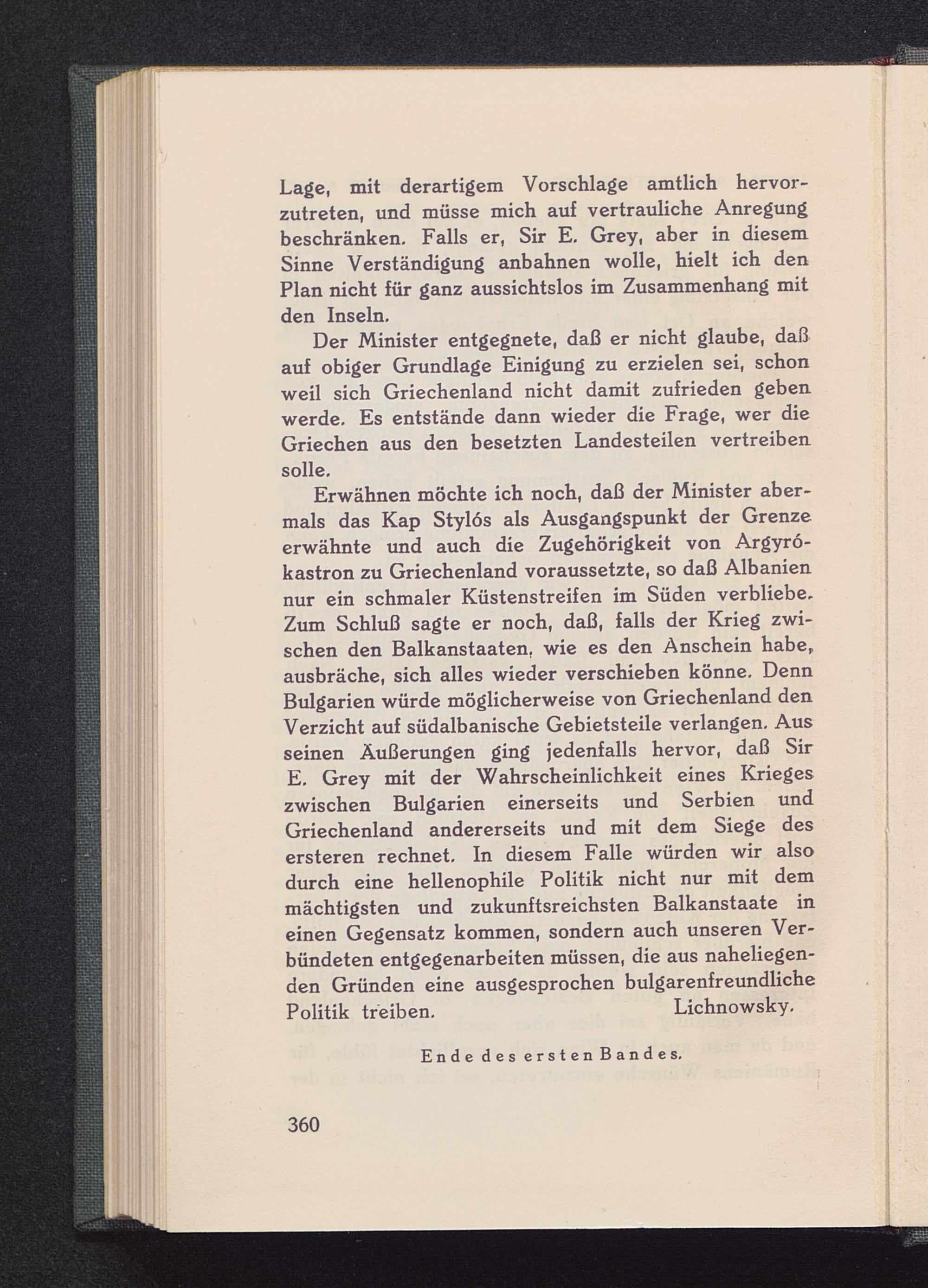 Erwähnen möchte ich noch, daß der Minister aber-mals das Kap Stylos als Ausgangspunkt der Grenzeerwähnte und auch die Zugehörigkeit von Argyro-kastron zu Griechenland voraussetzte, so daß Albanien nur ein schmaler Küstenstreifen im Süden verbliebe.Zum Schluß sagte er noch, daß, falls der Krieg zwi-schen den Balkanstaaten, wie es den Anschein habe,ausbräche, sich alles wieder verschieben könne. DennBulgarien würde möglicherweise von Griechenland denVerzicht auf südalbanische Gebietsteile verlangen. Ausseinen Äußerungen ging jedenfalls hervor, daß SirE. Grey mit der Wahrscheinlichkeit eines Kriegeszwischen Bulgarien einerseits und Serbien undGriechenland andererseits und mit dem Siege desersteren rechnet. In diesem Falle würden wir alsodurch eine hellenophile Politik nicht nur mit demmächtigsten und zukunftsreichsten Balkanstaate ineinen Gegensatz kommen, sondern auch unseren Ver-bündeten entgegenarbeiten müssen, die aus naheliegen-den Gründen eine ausgesprochen bulgarenfreundlichePolitik treiben. Lichnowsky.