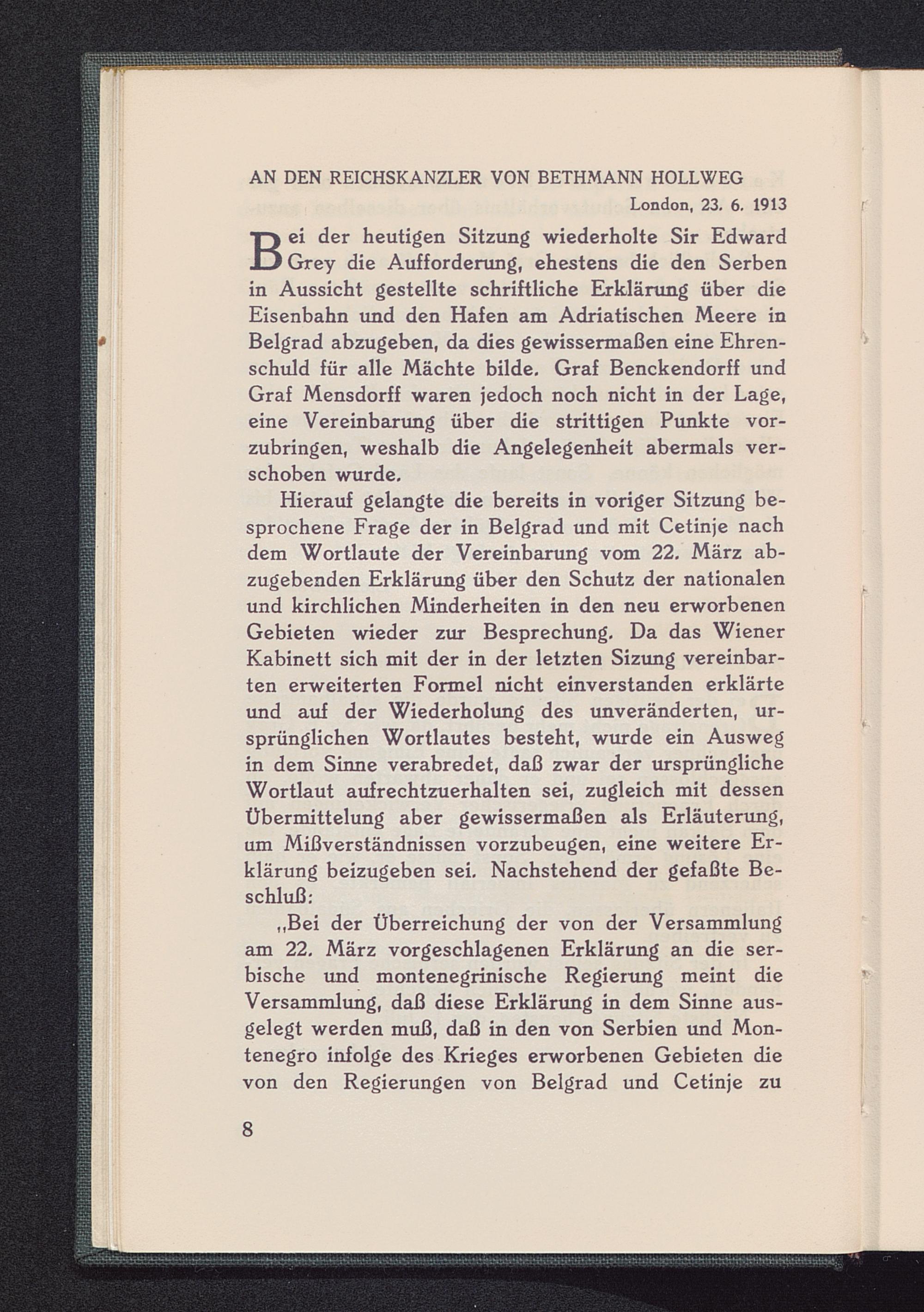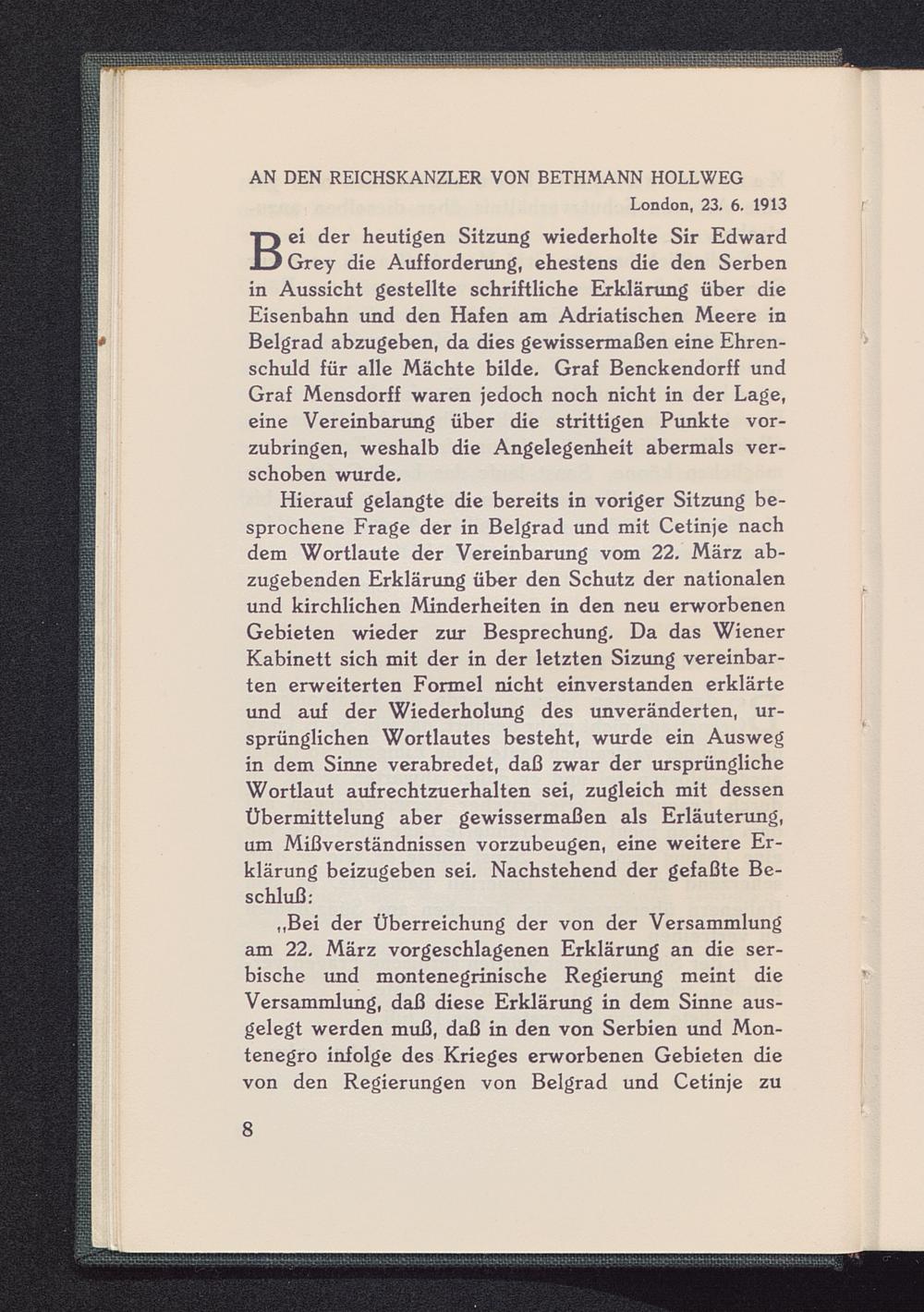 B ei der heutigen Sitzung wiederholte Sir EdwardGrey die Aufforderung, ehestens die den Serbenin Aussicht gestellte schriftliche Erklärung über dieEisenbahn und den Hafen am Adriatischen Meere inBelgrad abzugeben, da dies gewissermaßen eine Ehren-schuld für alle Mächte bilde. Graf Benckendorff undGraf Mensdorff waren jedoch noch nicht in der Lage,eine Vereinbarung über die strittigen Punkte vor-zubringen, weshalb die Angelegenheit abermals ver-schoben wurde.