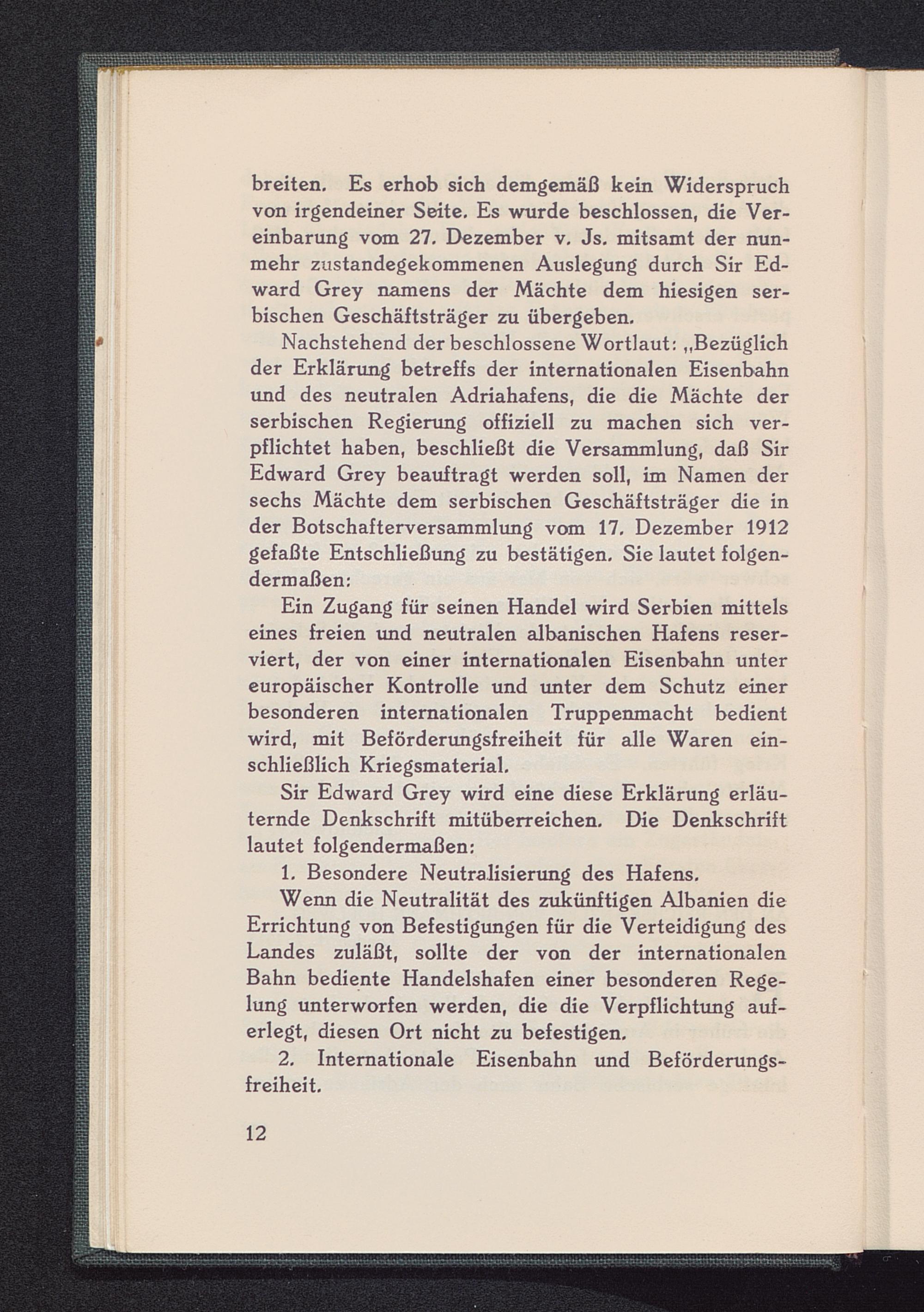 Nachstehend der beschlossene Wortlaut: „Bezüglichder Erklärung betreffs der internationalen Eisenbahnund des neutralen Adriahafens, die die Mächte derserbischen Regierung offiziell zu machen sich ver-pflichtet haben, beschließt die Versammlung, daß SirEdward Grey beauftragt werden soll, im Namen dersechs Mächte dem serbischen Geschäftsträger die inder Botschafterversammlung vom 17, Dezember 1912gefaßte Entschließung zu bestätigen. Sie lautet folgen-dermaßen: