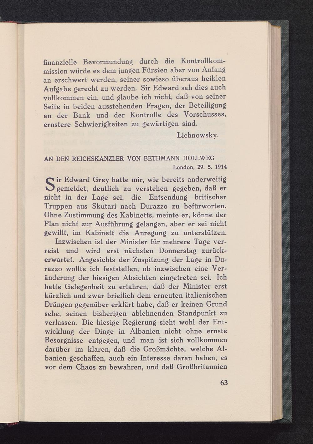 S ir Edward Grey hatte mir, wie bereits anderweitiggemeldet, deutlich zu verstehen gegeben, daß ernicht in der Lage sei, die Entsendung britischerTruppen aus Skutari nach Durazzo zu befürworten.Ohne Zustimmung des Kabinetts, meinte er, könne derPlan nicht zur Ausführung gelangen, aber er sei nichtgewillt, im Kabinett die Anregung zu unterstützen.