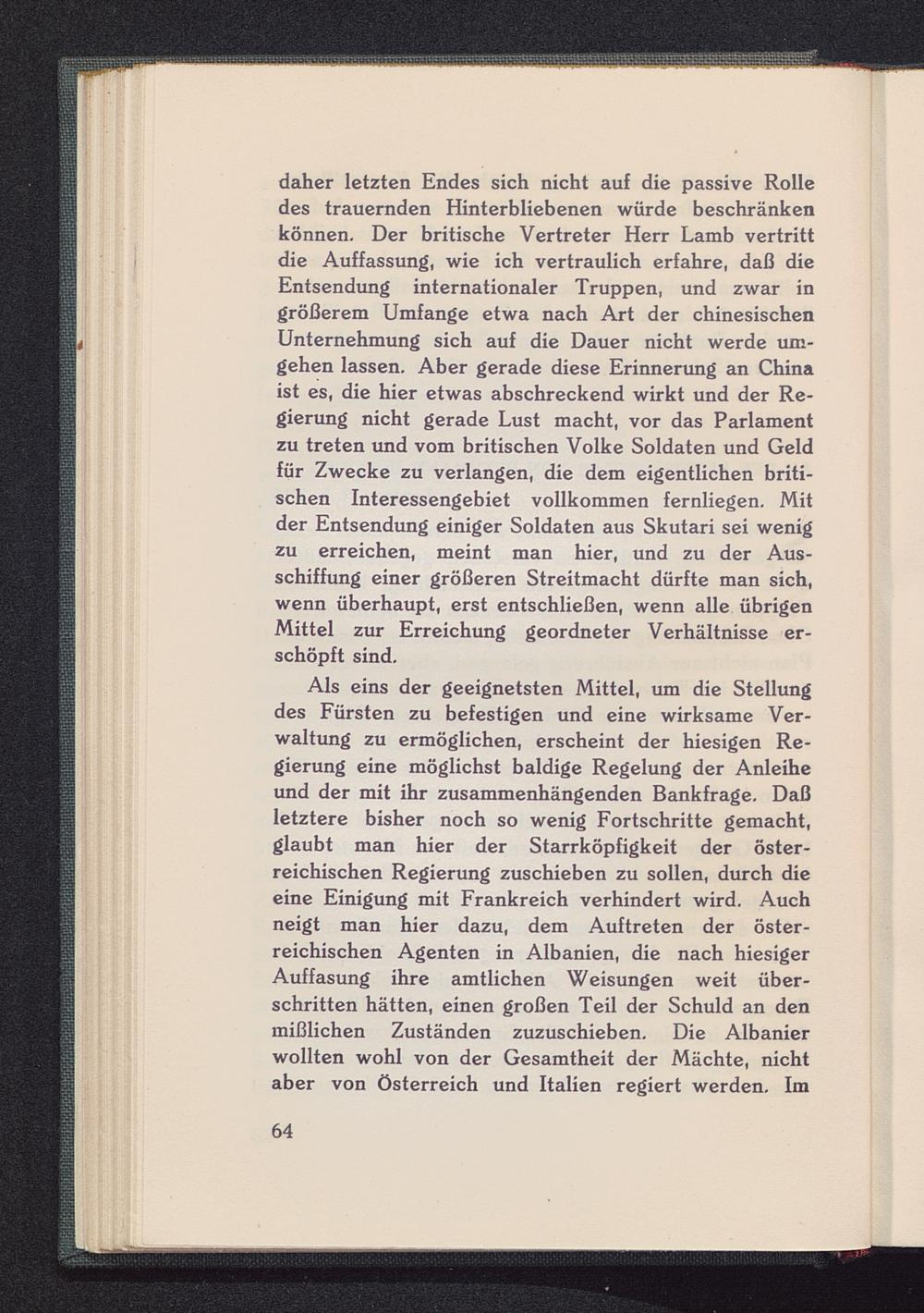 daher letzten Endes sich nicht auf die passive Rolledes trauernden Hinterbliebenen würde beschränkenkönnen. Der britische Vertreter Herr Lamb vertrittdie Auffassung, wie ich vertraulich erfahre, daß dieEntsendung internationaler Truppen, und zwar ingrößerem Umfange etwa nach Art der chinesischenUnternehmung sich auf die Dauer nicht werde um-gehen lassen. Aber gerade diese Erinnerung an Chinaist es, die hier etwas abschreckend wirkt und der Re-gierung nicht gerade Lust macht, vor das Parlamentzu treten und vom britischen Volke Soldaten und Geldfür Zwecke zu verlangen, die dem eigentlichen briti-schen Interessengebiet vollkommen fernliegen. Mitder Entsendung einiger Soldaten aus Skutari sei wenigzu erreichen, meint man hier, und zu der Aus-schiffung einer größeren Streitmacht dürfte man sich,wenn überhaupt, erst entschließen, wenn alle übrigenMittel zur Erreichung geordneter Verhältnisse er-schöpft sind.