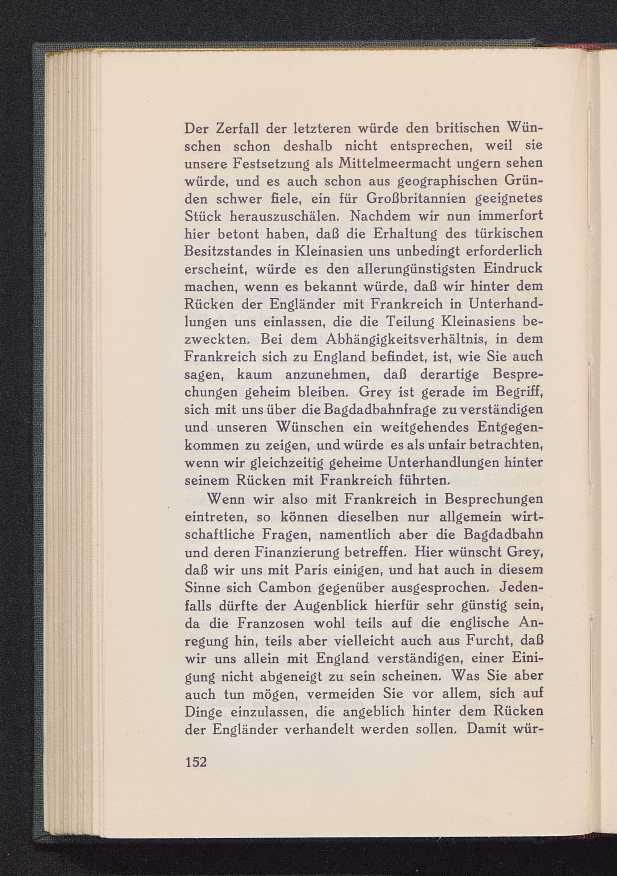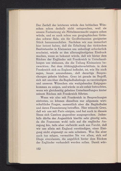 Der Zerfall der letzteren würde den britischen Wün-schen schon deshalb nicht entsprechen, weil sieunsere Festsetzung als Mittelmeermacht ungern sehenwürde, und es auch schon aus geographischen Grün-den schwer fiele, ein für Großbritannien geeignetesStück herauszuschälen. Nachdem wir nun immerforthier betont haben, daß die Erhaltung des türkischenBesitzstandes in Kleinasien uns unbedingt erforderlicherscheint, würde es den allerungünstigsten Eindruckmachen, wenn es bekannt würde, daß wir hinter demRücken der Engländer mit Frankreich in Unterhand-lungen uns einlassen, die die Teilung Kleinasiens be-zweckten. Bei dem Abhängigkeitsverhältnis, in demFrankreich sich zu England befindet, ist, wie Sie auchsagen, kaum anzunehmen, daß derartige Bespre-chungen geheim bleiben. Grey ist gerade im Begriff,sich mit uns über die Bagdadbahnfrage zu verständigenund unseren Wünschen ein weitgehendes Entgegen-kommen zu zeigen, und würde es als unfair betrachten,wenn wir gleichzeitig geheime Unterhandlungen hinterseinem Rücken mit Frankreich führten.