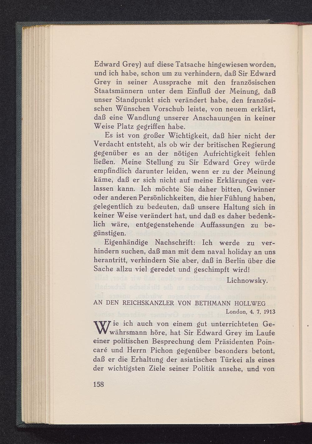 Edward Grey ) auf diese Tatsache hingewiesen worden,und ich habe, schon um zu verhindern, daß Sir EdwardGrey in seiner Aussprache mit den französischenStaatsmännern unter dem Einfluß der Meinung, daßunser Standpunkt sich verändert habe, den französi-schen Wünschen Vorschub leiste, von neuem erklärt,daß eine Wandlung unserer Anschauungen in keinerWeise Platz gegriffen habe.