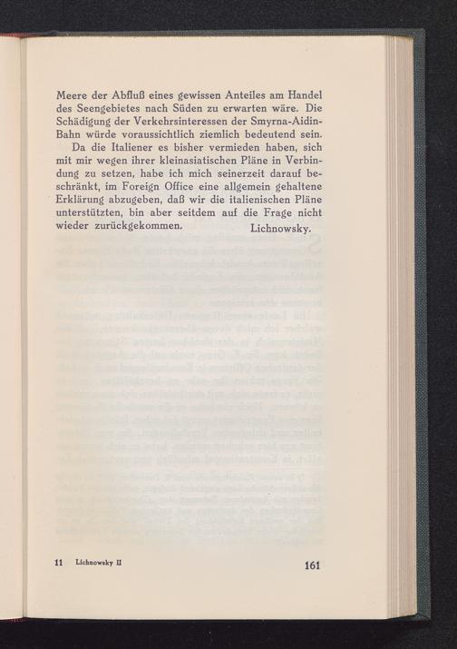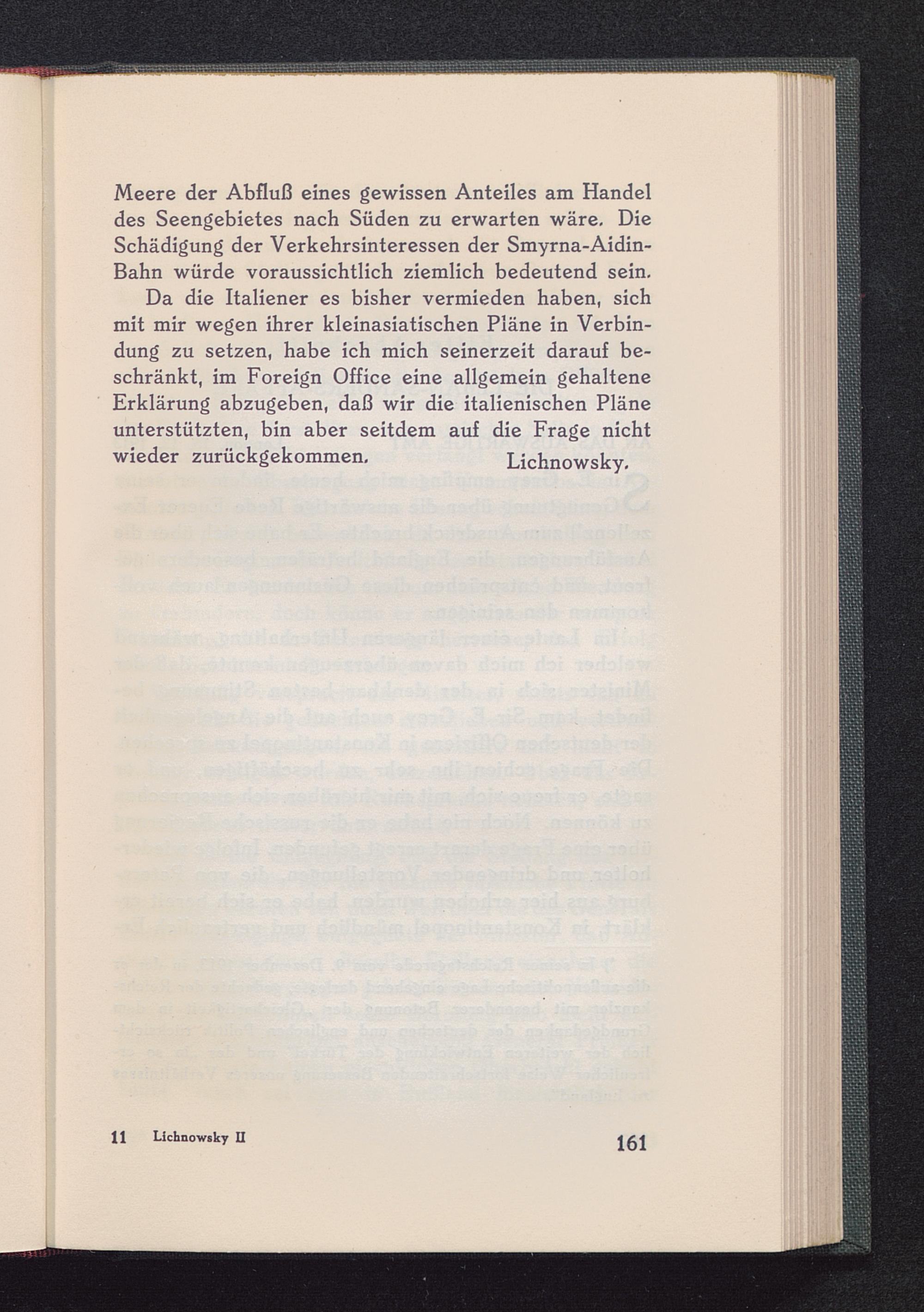 Da die Italiener es bisher vermieden haben, sichmit mir wegen ihrer kleinasiatischen Pläne in Verbin-dung zu setzen, habe ich mich seinerzeit darauf be-schränkt, im Foreign Office eine allgemein gehalteneErklärung abzugeben, daß wir die italienischen Pläneunterstützten, bin aber seitdem auf die Frage nichtwieder zurückgekommen. Lichnowsky.