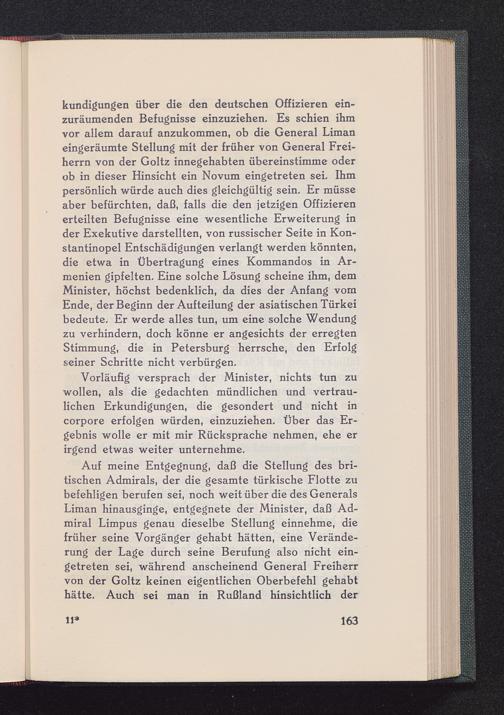 Auf meine Entgegnung, daß die Stellung des bri-tischen Admirals, der die gesamte türkische Flotte zubefehligen berufen sei, noch weit über die des GeneralsLiman hinausginge, entgegnete der Minister, daß Ad-miral Limpus genau dieselbe Stellung einnehme, diefrüher seine Vorgänger gehabt hätten, eine Verände-rung der Lage durch seine Berufung also nicht ein-getreten sei, während anscheinend General Freiherrvon der Goltz keinen eigentlichen Oberbefehl gehabthätte. Auch sei man in Rußland hinsichtlich der