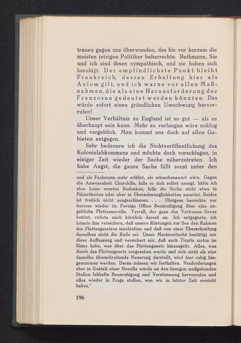 trauen gegen uns überwunden, das bis vor kurzem diemeisten jetzigen Politiker beherrschte. Bethmann, Sieund ich sind ihnen sympathisch, und sie haben sichberuhigt. Der empfindlichste Punkt bleibtFrankreich , dessen Erhaltung hier alsAxiom gilt, und ich warne vor allen Maß-nahmen, die als eine Herausforderung derFranzosen gedeutet werden könnten. Daswürde sofort einen gründlichen Umschwung hervor-rufen!