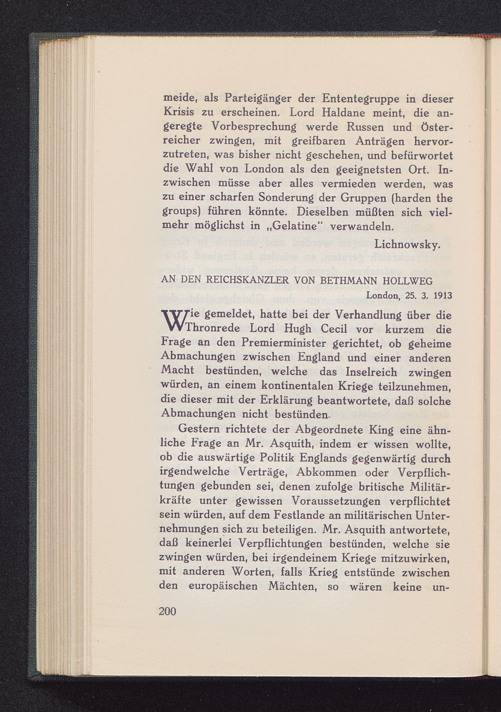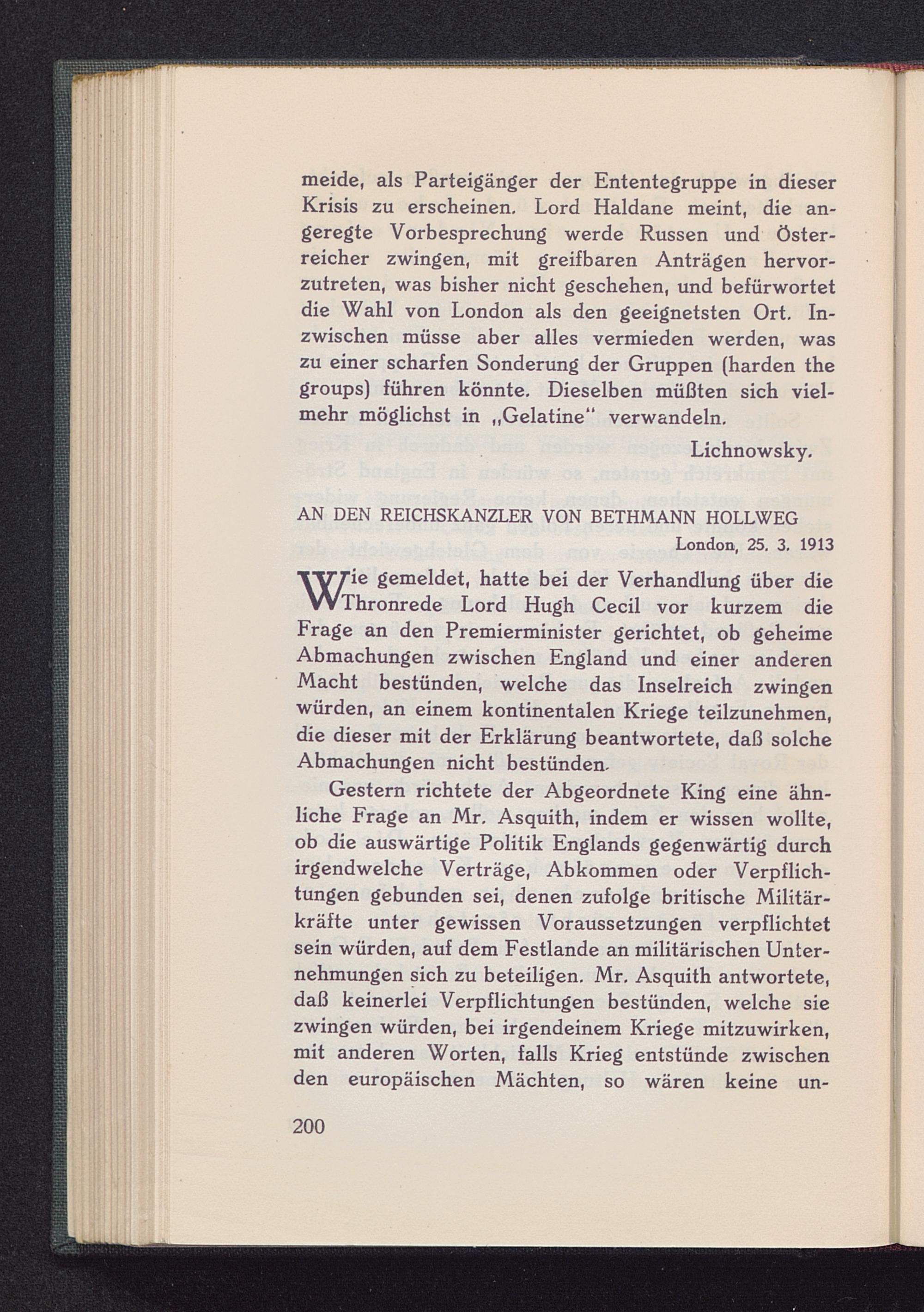 WThronrede Lord Hugh Cecil vor kurzem dieFrage an den Premierminister gerichtet, ob geheimeAbmachungen zwischen England und einer anderenMacht bestünden, welche das Inselreich zwingenwürden, an einem kontinentalen Kriege teilzunehmen,die dieser mit der Erklärung beantwortete, daß solcheAbmachungen nicht bestünden.
