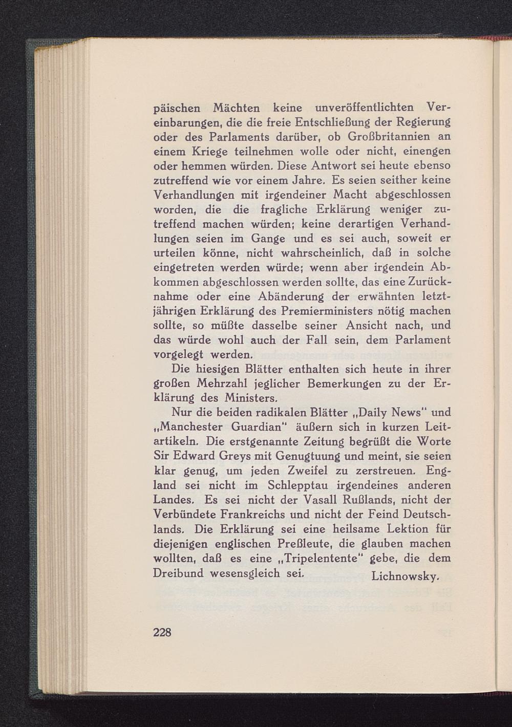 Nur die beiden radikalen Blätter „Daily News“ und„Manchester Guardian “ äußern sich in kurzen Leit-artikeln. Die erstgenannte Zeitung begrüßt die WorteSir Edward Greys mit Genugtuung und meint, sie seienklar genug, um jeden Zweifel zu zerstreuen. Eng-land sei nicht im Schlepptau irgendeines anderenLandes. Es sei nicht der Vasall Rußlands , nicht derVerbündete Frankreichs und nicht der Feind Deutsch-lands . Die Erklärung sei eine heilsame Lektion fürdiejenigen englischen Preßleute, die glauben machenwollten, daß es eine „Tripelentente“ gebe, die demDreibund wesensgleich sei. Lichnowsky.
