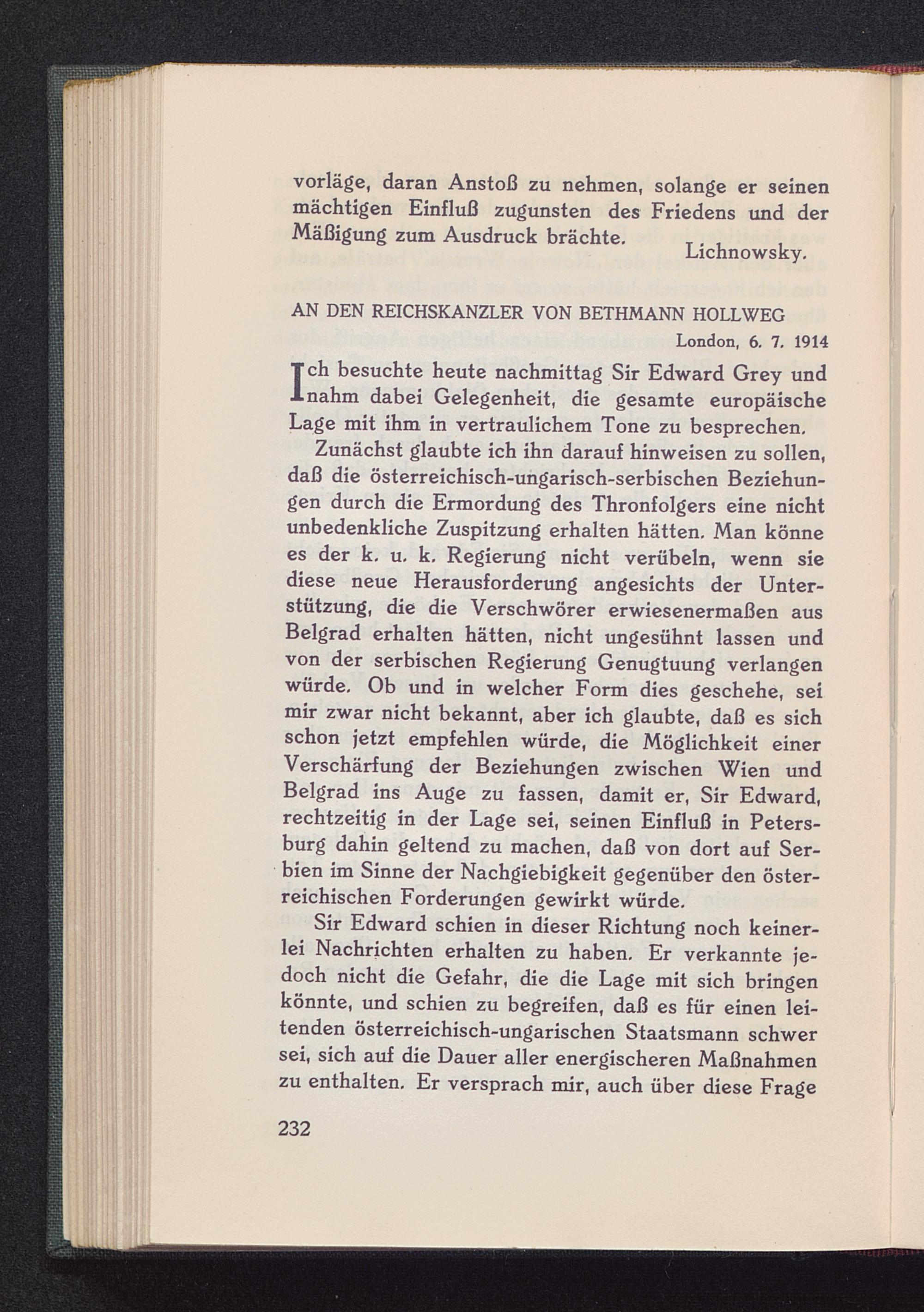 Zunächst glaubte ich ihn darauf hinweisen zu sollen,daß die österreichisch-ungarisch-serbischen Beziehun-gen durch die Ermordung des Thronfolgers eine nichtunbedenkliche Zuspitzung erhalten hätten. Man könnees der k. u. k. Regierung nicht verübeln, wenn siediese neue Herausforderung angesichts der Unter-stützung, die die Verschwörer erwiesenermaßen ausBelgrad erhalten hätten, nicht ungesühnt lassen undvon der serbischen Regierung Genugtuung verlangenwürde. Ob und in welcher Form dies geschehe, seimir zwar nicht bekannt, aber ich glaubte, daß es sichschon jetzt empfehlen würde, die Möglichkeit einerVerschärfung der Beziehungen zwischen Wien undBelgrad ins Auge zu fassen, damit er, Sir Edward,rechtzeitig in der Lage sei, seinen Einfluß in Peters-burg dahin geltend zu machen, daß von dort auf Ser-bien im Sinne der Nachgiebigkeit gegenüber den öster-reichischen Forderungen gewirkt würde,