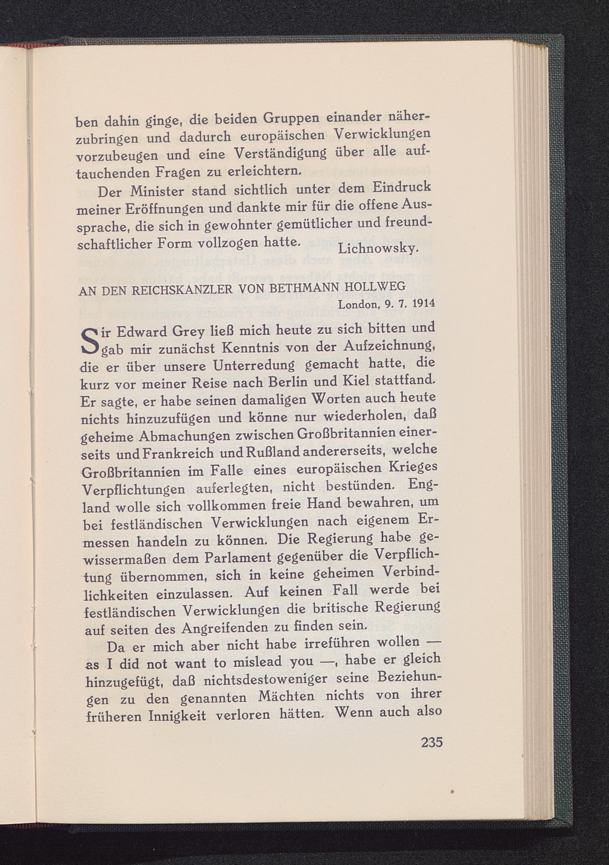 S ir Edward Grey ließ mich heute zu sich bitten undgab mir zunächst Kenntnis von der Aufzeichnung,die er über unsere Unterredung gemacht hatte, diekurz vor meiner Reise nach Berlin und Kiel stattfand.Er sagte, er habe seinen damaligen Worten auch heutenichts hinzuzufügen und könne nur wiederholen, daßgeheime Abmachungen zwischen Großbritannien einer-seits und Frankreich und Rußland andererseits, welcheGroßbritannien im Falle eines europäischen KriegesVerpflichtungen auf erlegten, nicht bestünden. Eng-land wolle sich vollkommen freie Hand bewahren, umbei festländischen Verwicklungen nach eigenem Er-messen handeln zu können. Die Regierung habe ge-wissermaßen dem Parlament gegenüber die Verpflich-tung übernommen, sich in keine geheimen Verbind-lichkeiten einzulassen. Auf keinen Fall werde beifestländischen Verwicklungen die britische Regierungauf seiten des Angreifenden zu finden sein.