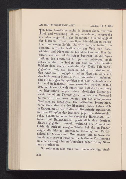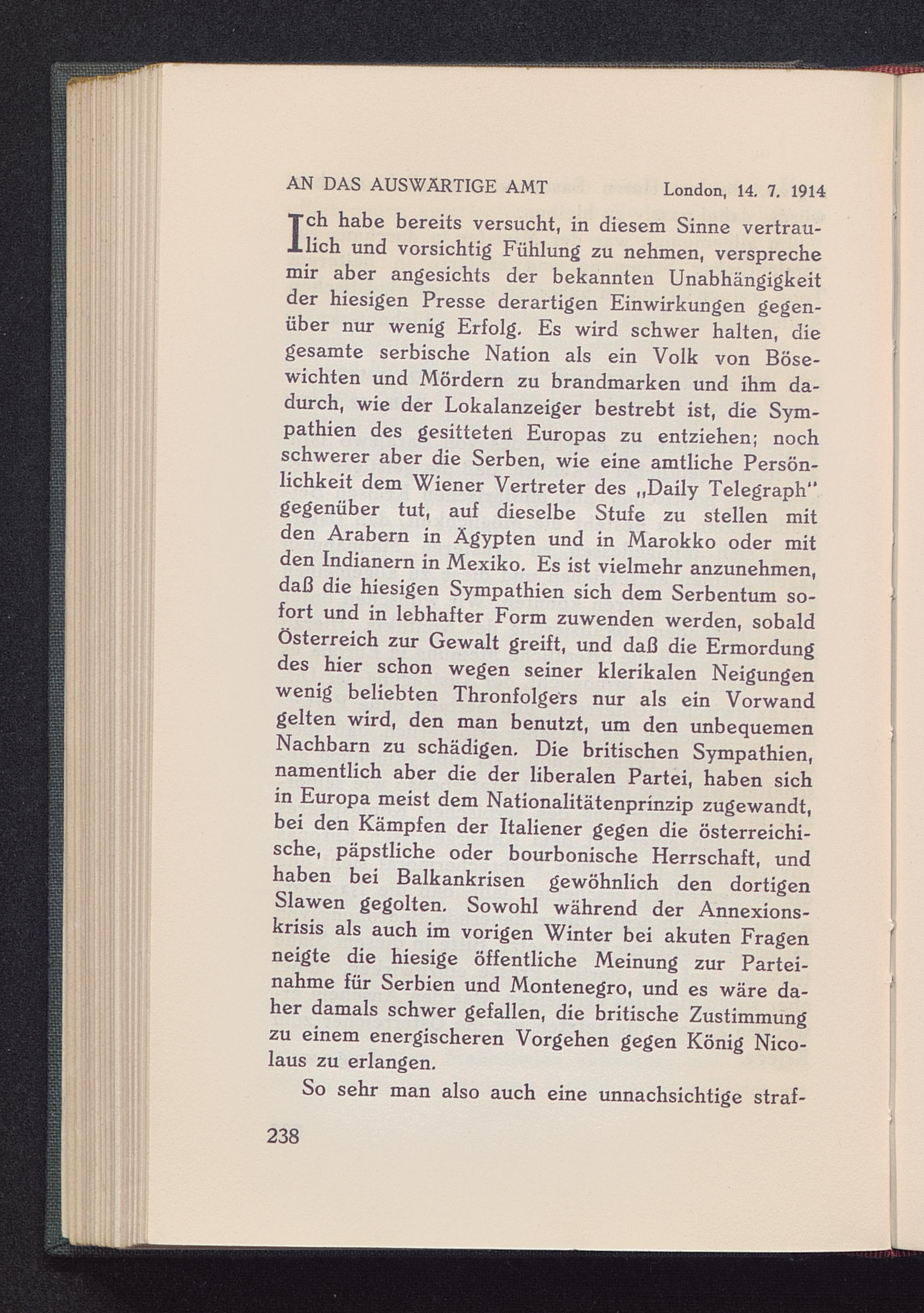 I ch habe bereits versucht, in diesem Sinne vertrau-lich und vorsichtig Fühlung zu nehmen, versprechemir aber angesichts der bekannten Unabhängigkeitder hiesigen Presse derartigen Einwirkungen gegen-über nur wenig Erfolg. Es wird schwer halten, diegesamte serbische Nation als ein Volk von Böse-wichten und Mördern zu brandmarken und ihm da-durch, wie der Lokalanzeiger bestrebt ist, die Sym-pathien des gesitteten Europas zu entziehen; nochschwerer aber die Serben, wie eine amtliche Persön-lichkeit dem Wiener Vertreter des „Daily Telegraph "gegenüber tut, auf dieselbe Stufe zu stellen mitden Arabern in Ägypten und in Marokko oder mitden Indianern in Mexiko . Es ist vielmehr anzunehmen,daß die hiesigen Sympathien sich dem Serbentum so-fort und in lebhafter Form zuwenden werden, sobaldÖsterreich zur Gewalt greift, und daß die Ermordungdes hier schon wegen seiner klerikalen Neigungenwenig beliebten Thronfolgers nur als ein Vorwandgelten wird, den man benutzt, um den unbequemenNachbarn zu schädigen. Die britischen Sympathien,namentlich aber die der liberalen Partei, haben sichin Europa meist dem Nationalitätenprinzip zugewandt,bei den Kämpfen der Italiener gegen die österreichi-sche, päpstliche oder bourbonische Herrschaft, undhaben bei Balkankrisen gewöhnlich den dortigenSlawen gegolten. Sowohl während der Annexions-krisis als auch im vorigen Winter bei akuten Fragenneigte die hiesige öffentliche Meinung zur Partei-nahme für Serbien und Montenegro, und es wäre da-her damals schwer gefallen, die britische Zustimmungzu einem energischeren Vorgehen gegen König Nico-laus zu erlangen.