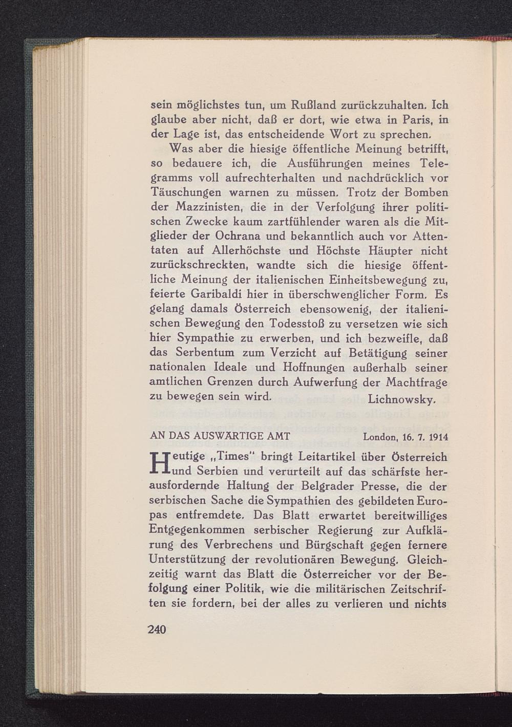 Was aber die hiesige öffentliche Meinung betrifft,so bedauere ich, die Ausführungen meines Tele-gramms voll aufrechterhalten und nachdrücklich vorTäuschungen warnen zu müssen. Trotz der Bombender Mazzinisten, die in der Verfolgung ihrer politi-schen Zwecke kaum zartfühlender waren als die Mit-glieder der Ochrana und bekanntlich auch vor Atten-taten auf Allerhöchste und Höchste Häupter nichtzurückschreckten, wandte sich die hiesige öffent-liche Meinung der italienischen Einheitsbewegung zu,feierte Garibaldi hier in überschwenglicher Form. Esgelang damals Österreich ebensowenig, der italieni-schen Bewegung den Todesstoß zu versetzen wie sichhier Sympathie zu erwerben, und ich bezweifle, daßdas Serbentum zum Verzicht auf Betätigung seinernationalen Ideale und Hoffnungen außerhalb seineramtlichen Grenzen durch Aufwerfung der Machtfragezu bewegen sein wird. Lichnowsky.