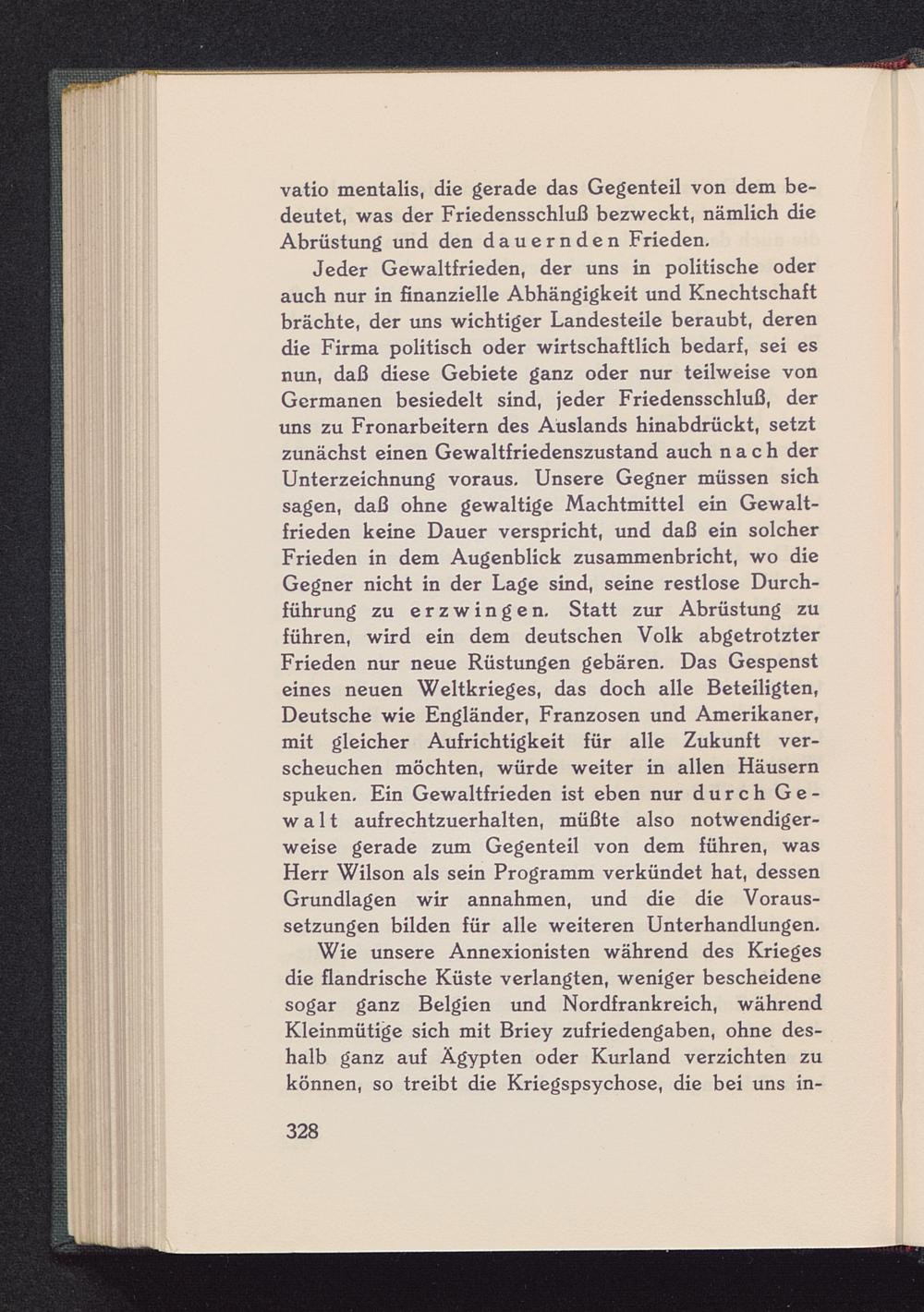 Jeder Gewaltfrieden, der uns in politische oderauch nur in finanzielle Abhängigkeit und Knechtschaftbrächte, der uns wichtiger Landesteile beraubt, derendie Firma politisch oder wirtschaftlich bedarf, sei esnun, daß diese Gebiete ganz oder nur teilweise vonGermanen besiedelt sind, jeder Friedensschluß, deruns zu Fronarbeitern des Auslands hinabdrückt, setztzunächst einen Gewaltfriedenszustand auch nach derUnterzeichnung voraus. Unsere Gegner müssen sichsagen, daß ohne gewaltige Machtmittel ein Gewalt-frieden keine Dauer verspricht, und daß ein solcherFrieden in dem Augenblick zusammenbricht, wo dieGegner nicht in der Lage sind, seine restlose Durch-führung zu erzwingen. Statt zur Abrüstung zuführen, wird ein dem deutschen Volk abgetrotzterFrieden nur neue Rüstungen gebären. Das Gespensteines neuen Weltkrieges, das doch alle Beteiligten,Deutsche wie Engländer, Franzosen und Amerikaner,mit gleicher Aufrichtigkeit für alle Zukunft ver-scheuchen möchten, würde weiter in allen Häusernspuken. Ein Gewaltfrieden ist eben nur durch Ge-walt aufrechtzuerhalten, müßte also notwendiger-weise gerade zum Gegenteil von dem führen, wasHerr Wilson als sein Programm verkündet hat, dessenGrundlagen wir annahmen, und die die Voraus-setzungen bilden für alle weiteren Unterhandlungen.