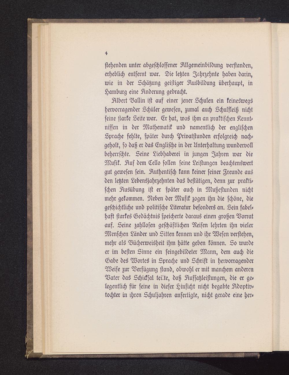 Albert Ballin ist auf einer jener Schulen ein keineswegshervorragender Schüler gewesen, zumal auch Schulfleiß nichtseine starke Seite war. Er hat, was ihm an praktischen Kennt-nissen in der Mathematik und namentlich der englischenSprache fehlte, später durch Privatstunden erfolgreich nach-geholt, so daß er das Englische in der Unterhaltung wundervollbeherrschte. Leine Liebhaberei in jungen Jahren war dieMusik. Auf dem Cello sollen seine Leistungen beachtenswertgut gewesen sein. Authentisch kann keiner seiner Freunde ausden letzten Lebensjahrzehnten das bestätigen, denn zur prakti-schen Ausübung ist er später auch in Mußestunden nichtmehr gekommen. Neben der Musik zogen ihn die schöne, diegeschichtliche und politische Literatur besonders an. Lein fabel-haft starkes Gedächtnis speicherte daraus einen großen Vorratauf. Seine zahllosen geschäftlichen Reisen lehrten ihn vielerMenschen Länder und Sitten kennen und ihr Wesen verstehen,mehr als Bücherweisheit ihm hätte geben können. So wurdeer im besten Sinne ein feingebildeter Mann, dem auch dieGabe des Wortes in Sprache und Schrift in hervorragenderWeise zur Verfügung stand, obwohl er mit manchem anderenVater das Schicksal teilte, daß Äufsatzleistungen, die er ge-legentlich für seine in dieser Hinsicht nicht begabte Adoptiv-tochter in ihren Schuljahren anfertigte, nicht gerade eine her-
