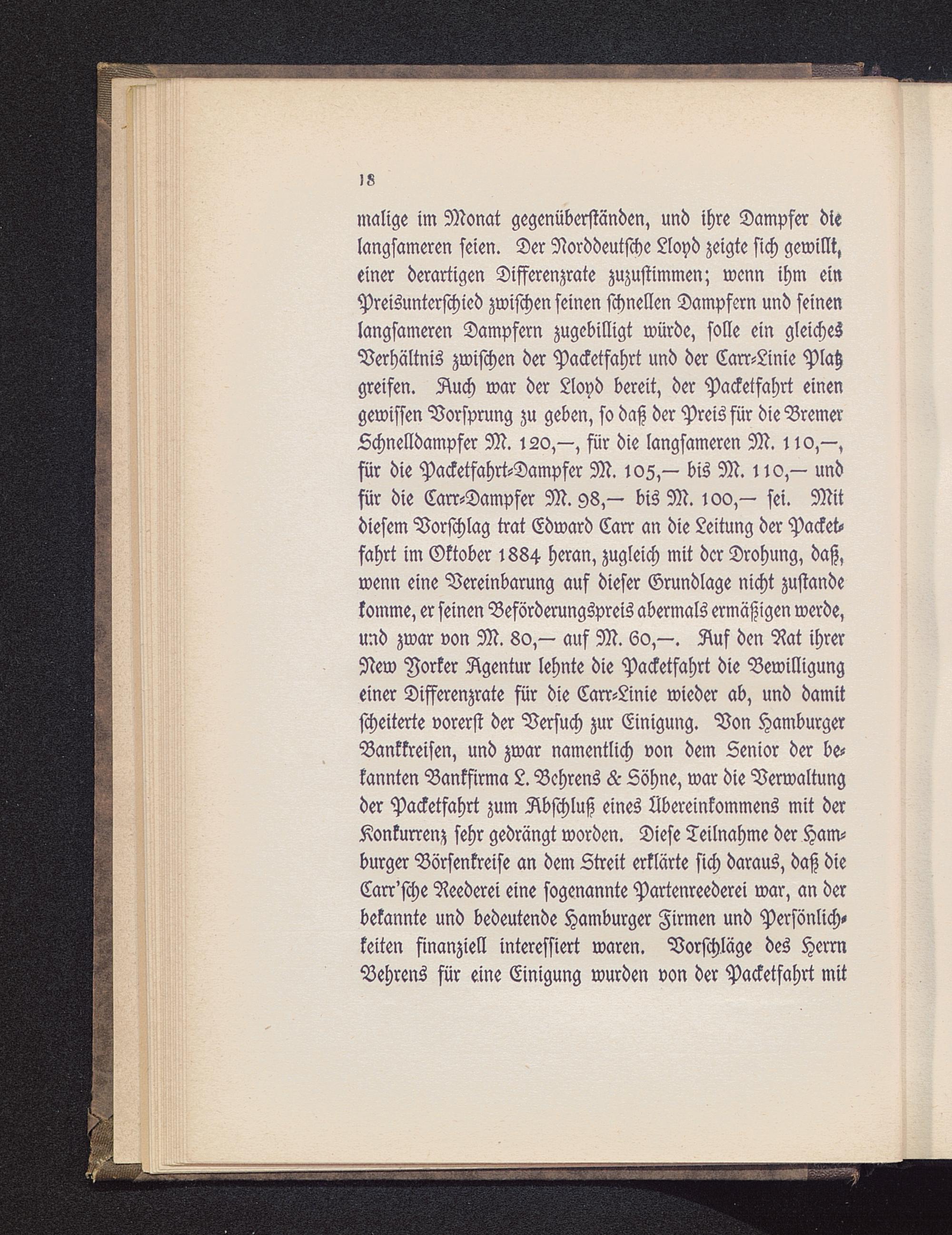 malige im Monat gegenüberstanden, und ihre Dampfer dielangsameren seien. Der Norddeutsche Lloyd zeigte sich gewillt,einer derartigen Differenzrate zuzustimmen; wenn ihm einPreisunterschied zwischen seinen schnellen Dampfern und seinenlangsameren Dampfern zugebilligt würde, solle ein gleichesVerhältnis zwischen der Packetfahrt und der Carr-Linie Platzgreifen. Auch war der Lloyd bereit, der Packetfahrt einengewissen Vorsprang zu geben, so daß der Preis für die BremerSchnelldampfer M. 120,—, für die langsameren M. 110,—,für die Packetfahrt-Dampfer M. 10Z,— bis M. HO,— undfür die Carr-Dampfer M. 98,— bis M. 100,— sei. Mitdiesem Vorschlag trat Edward Carr an die Leitung der Packet-fahrt im Oktober 1884 heran, zugleich mit der Drohung, daß,wenn eine Vereinbarung auf dieser Grundlage nicht zustandekomme, er seinen Beförderungspreis abermals ermäßigen werde,und zwar von M. 80,— auf M. 60,—. Aus den Bat ihrerNew Yorker Agentur lehnte die Packetfahrt die Bewilligungeiner Differenzrate für die Carr-Linie wieder ab, und damitscheiterte vorerst der Versuch zur Einigung. Von HamburgerBankkreisen, und zwar namentlich von dem Senior der be-kannten Bankfirma L. Bohrens L Löhne, war die Verwaltungder Packetfahrt zum Abschluß eines Übereinkommens mit derKonkurrenz sehr gedrängt worden. Diese Teilnahme der Ham-burger Börsenkreise an dem Streit erklärte sich daraus, daß dieCarr'sche Reederei eine sogenannte Partenreederei war, an derbekannte und bedeutende Hamburger Firmen und Persönlich,keiten finanziell interessiert waren. Vorschläge des HerrnVehrens für eine Einigung wurden von der Packetfahrt mit