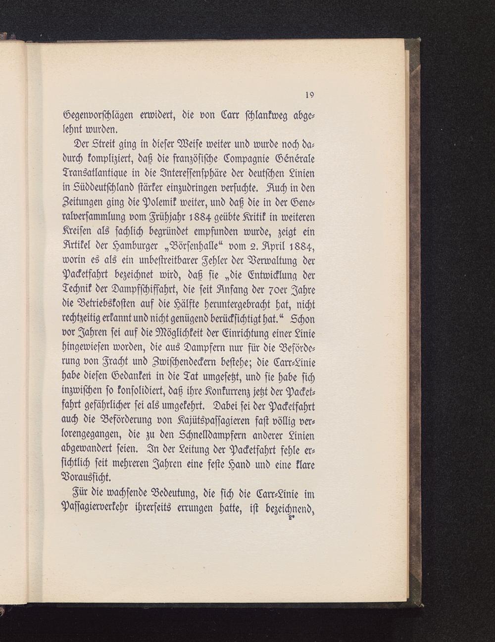 Der Streit ging in dieser Weise weiter und wurde noch da-durch kompliziert, daß die französische Compagnie GeneraleTransatlantique in die Interessensphäre der deutschen Linienin Lüddeutschland stärker einzudringen versuchte. Auch in denZeitungen ging die Polemik weiter, und daß die in der Gene-ralversammlung vom Frühjahr 1884 geübte Kritik in weiterenKreisen als sachlich begründet empfunden wurde, zeigt einArtikel der Hamburger „Börsenhalle" vom 2. April 1884,worin es als ein unbestreitbarer Fehler der Verwaltung derPacketfahrt bezeichnet wird, daß sie »die Entwicklung derTechnik der Dampfschiffahrt, die seit Anfang der 70er Jahredie Betriebskosten auf die Hälfte heruntergebracht hat, nichtrechtzeitig erkannt und nicht genügend berücksichtigt hat." Schonvor Jahren sei auf die Möglichkeit der Einrichtung einer Liniehingewiesen worden, die aus Dampfern nur für die Beförde-rung von Fracht und Zwischendecken bestehe; die Carr-Liniehabe diesen Gedanken in die Tat umgesetzt, und sie habe sichinzwischen so konsolidiert, daß ihre Konkurrenz jetzt der Packet-fahrt gefährlicher sei als umgekehrt. Dabei sei der Packetfahrtauch die Beförderung von Kajütspassagieren fast völlig ver-lorengegangen, die zu den Schnelldampfern anderer Linienabgewandert seien. In der Leitung der Packetfahrt fehle er-sichtlich seit mehreren Jahren eine feste Hand und eine klareVoraussicht.