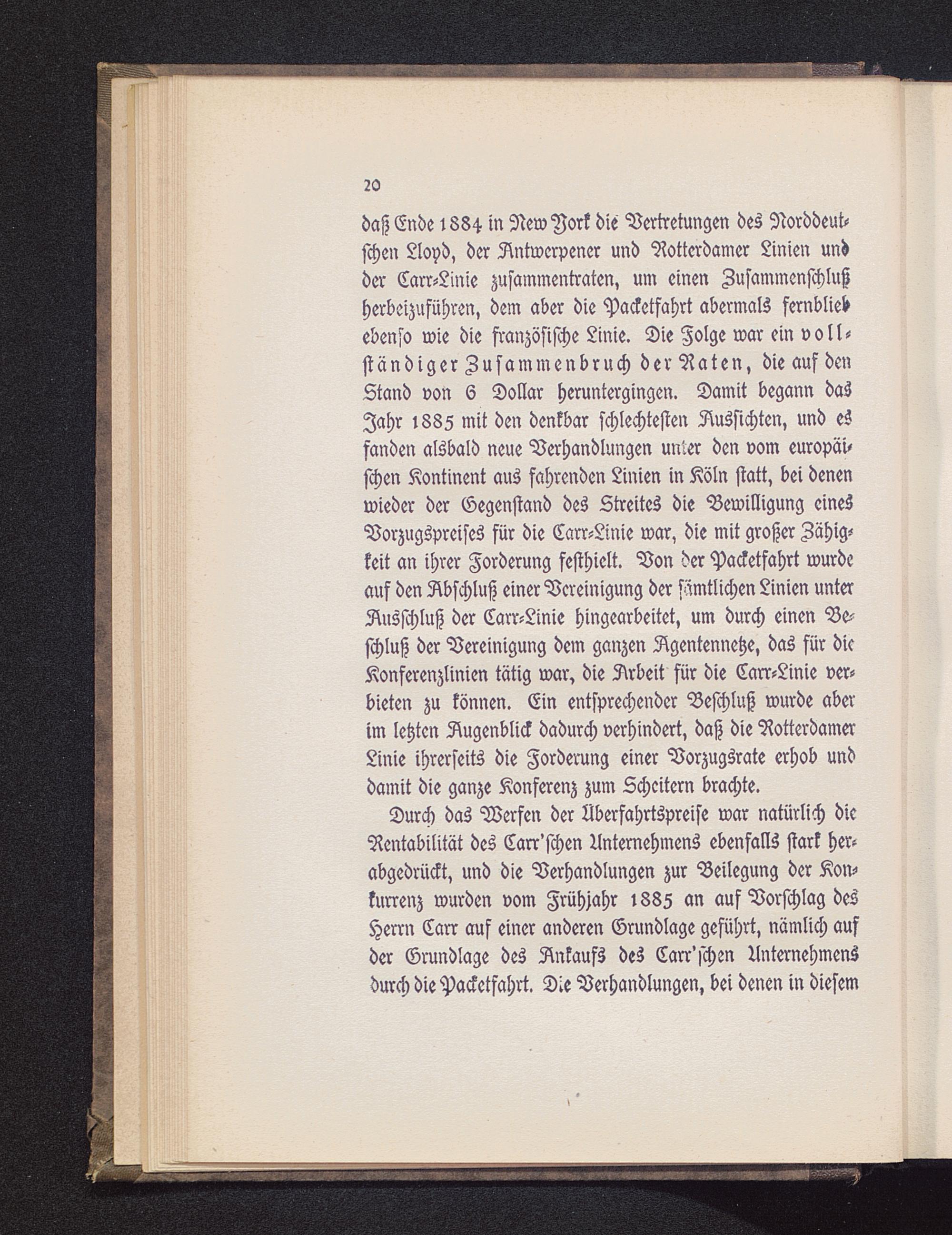 daß Ende 1884 in New Bork die Vertretungen des Norddeut-schen Lloyd , der Antwerpener und Rotterdamer Linien undder Carr-Linie zusammentraten, um einen Zusammenschlußherbeizuführen, dem aber die Packetfahrt abermals fernbliebebenso wie die französische Linie. Die Folge war ein voll-ständiger Zusammen bruch der Raten, die auf denStand von 6 Dollar heruntergingen. Damit begann dasJahr 1885 mit den denkbar schlechtesten Aussichten, und esfanden alsbald neue Verhandlungen unter den vom europäi-schen Kontinent aus fahrenden Linien in Köln statt, bei denenwieder der Gegenstand des Streites die Bewilligung einesVorzugspreises für die Carr-Linie war, die mit großer Zähig-keit an ihrer Forderung festhielt. Von der Packetfahrt wurdeauf den Abschluß einer Vereinigung der sämtlichen Linien unterAusschluß der Carr-Linie hingearbeitet, um durch einen Be-schluß der Vereinigung dem ganzen Agentennehe, das für dieKonferenzlinien tätig war, die Arbeit für die Carr-Linie ver-bieten zu können. Ein entsprechender Beschluß wurde aberim letzten Augenblick dadurch verhindert, daß die RotterdamerLinie ihrerseits die Forderung einer Vorzugsrate erhob unddamit die ganze Konferenz zum Scheitern brachte.