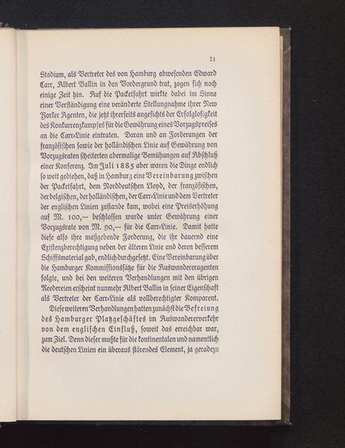 DieseweiterenVerhandlungen hatten zunächst dieBefreiungdes Hamburger Platzgeschäftes im Auswandererverkehrvon dem englischen Einfluß, soweit das erreichbar war,zum Ziel. Denn dieser mußte für die kontinentalen und namentlichdie deutschen Linien ein überaus störendes Element, ja geradezu