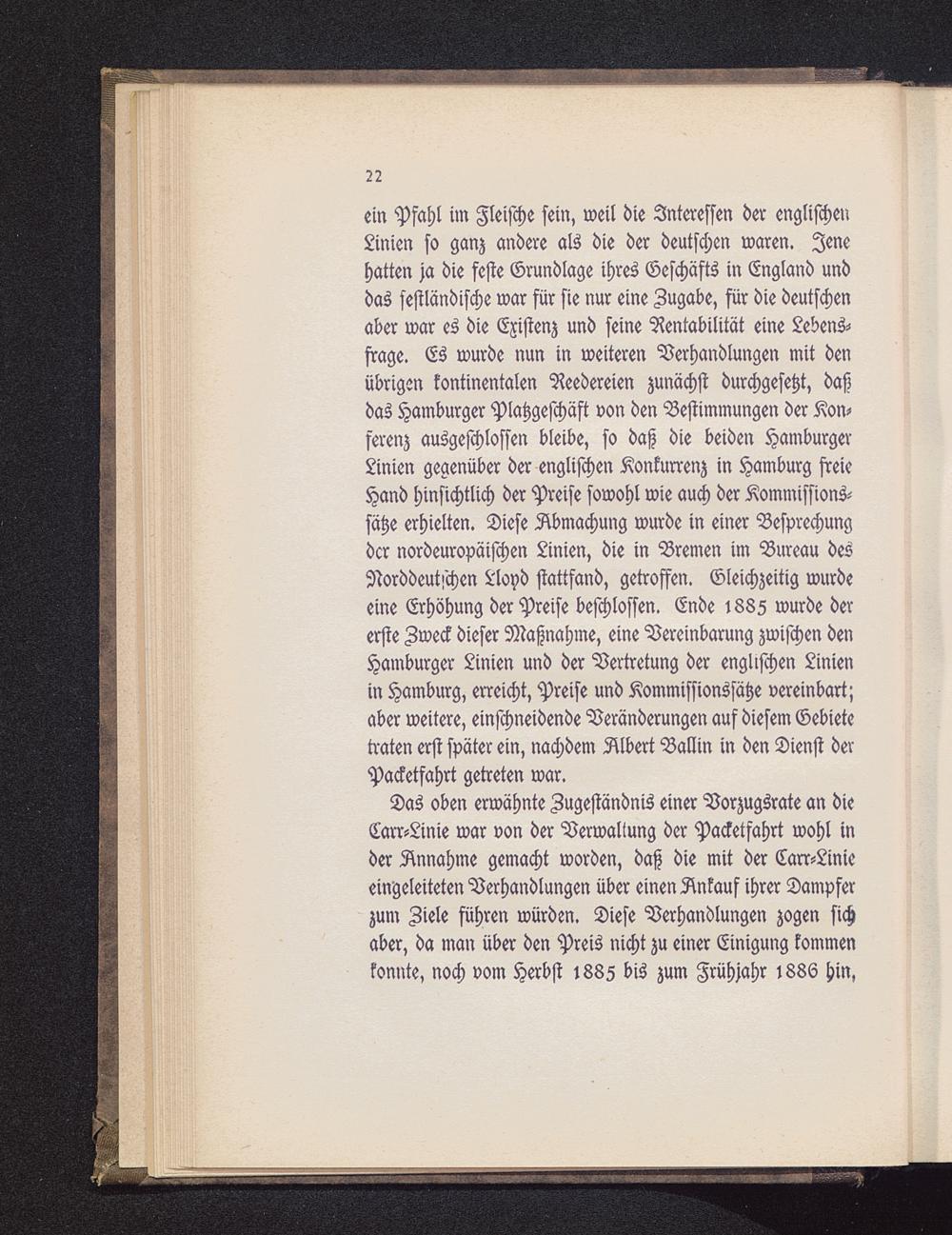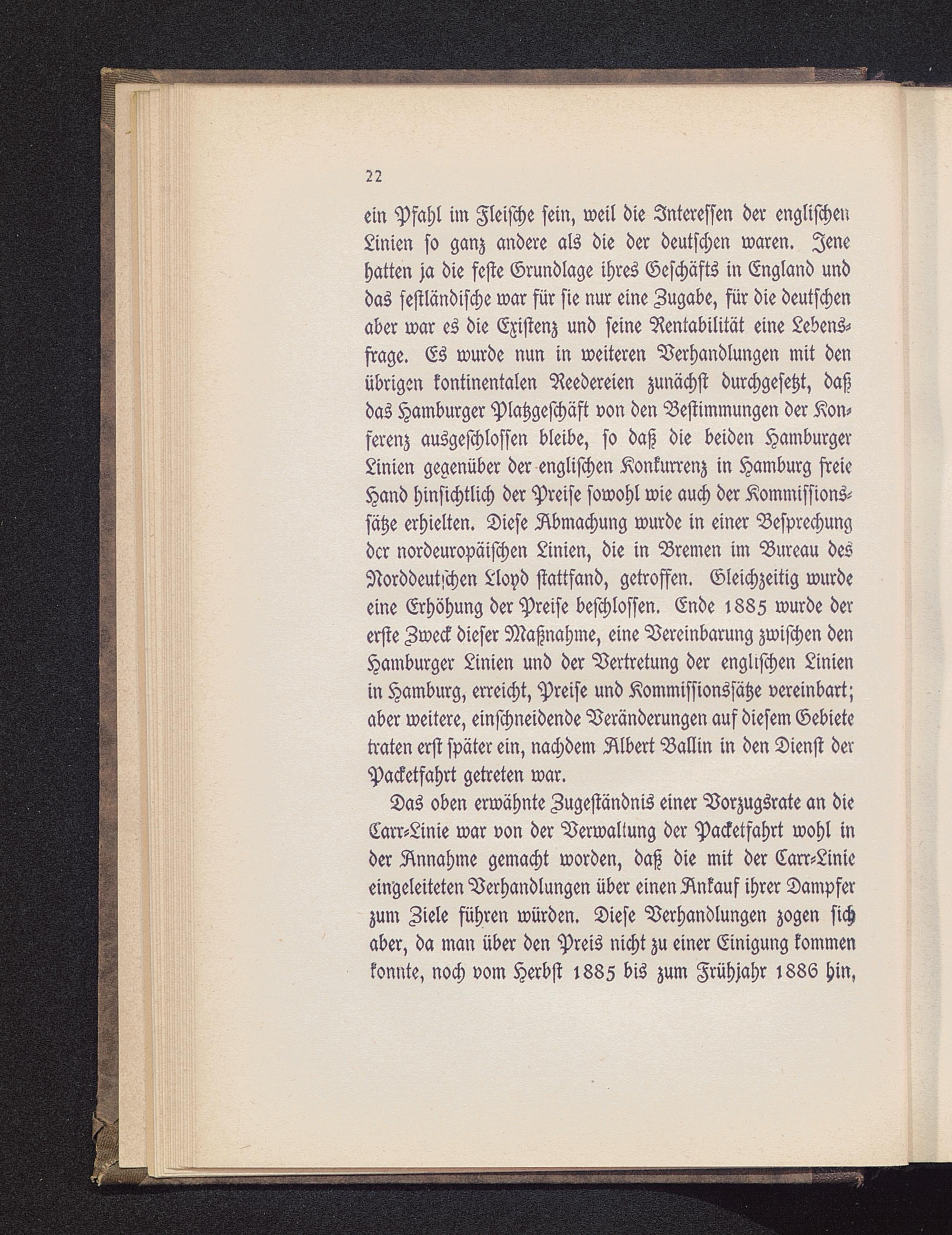 ein Pfahl im Fleische sein, weil die Interessen der englischer!Linien so ganz andere als die der deutschen waren. Jenehatten ja die feste Grundlage ihres Geschäfts in England unddas festländische war für sie nur eine Zugabe, für die deutschenaber war es die Existenz und seine Rentabilität eine Lebens-frage. Es wurde nun in weiteren Verhandlungen mit denübrigen kontinentalen Reedereien zunächst durchgesetzt, daßdas Hamburger Platzgeschäft von den Bestimmungen der Kon-ferenz ausgeschlossen bleibe, so daß die beiden Hamburger-Linien gegenüber der englischen Konkurrenz in Hamburg freieHand hinsichtlich der Preise sowohl wie auch der Kommissions-sätze erhielten. Diese Abmachung wurde in einer Besprechungder nordeuropäischen Linien, die in Bremen im Bureau desNorddeutschen Lloyd stattfand, getroffen. Gleichzeitig wurdeeine Erhöhung der Preise beschlossen. Ende 188Z wurde dererste Zweck dieser Maßnahme, eine Vereinbarung zwischen denHamburger Linien und der Vertretung der englischen Linienin Hamburg , erreicht, Preise und Kommissionssätze vereinbart;aber weitere, einschneidende Veränderungen auf diesem Gebietetraten erst später ein, nachdem Albert Ballin in den Dienst derPacketfahrt getreten war.