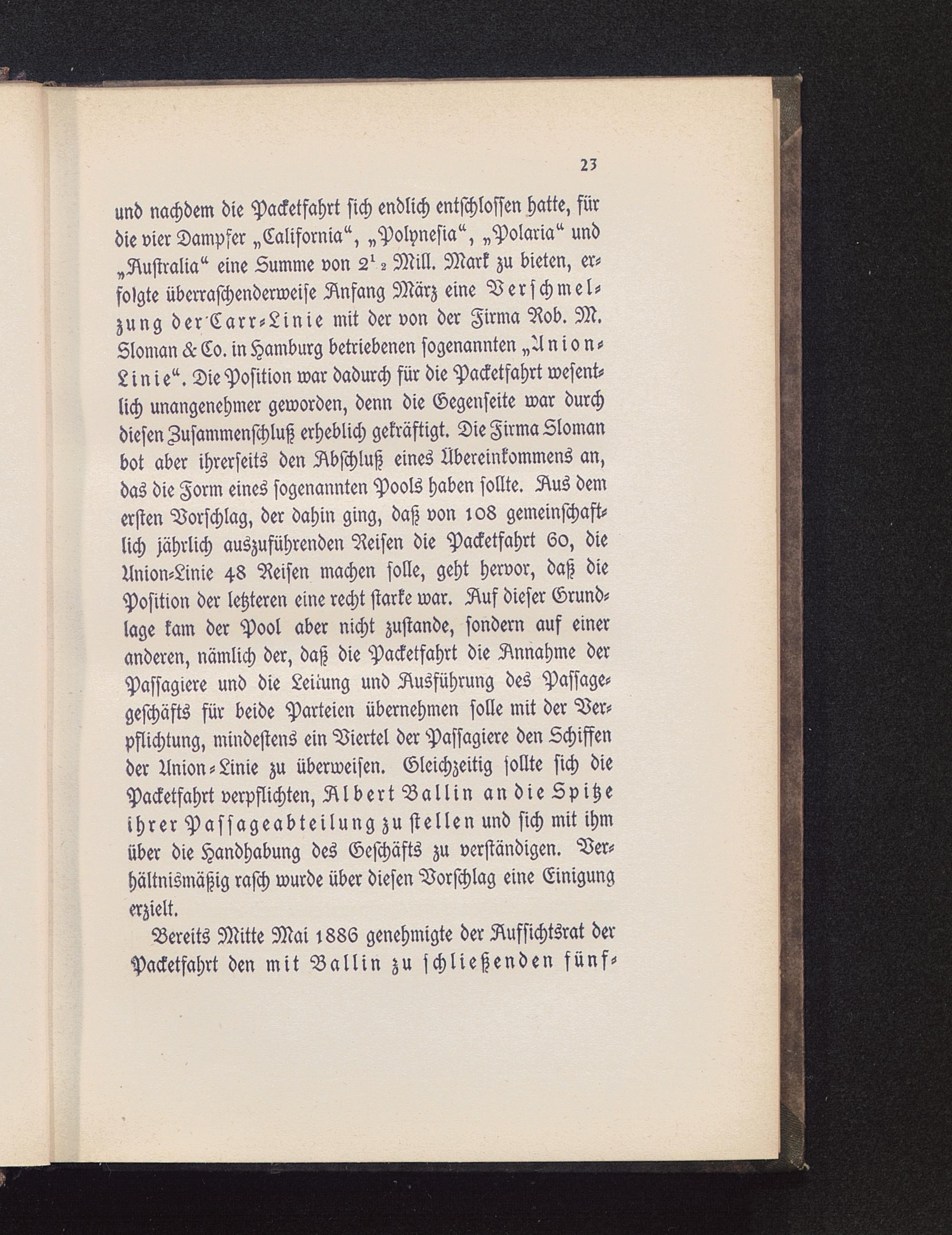 und nachdem die Packetfahrt sich endlich entschlossen hatte, fürdie vier Dampfer „California", „Polynesia ", „Polaria" und„Australia " eine Summe von 2^ - Mill. Mark zu bieten, er-folgte überraschenderweise Anfang März eine Verschmel-zung der Carr-Linie mit der von der Zirma Rob. M.Sloman L Co. in Hamburg betriebenen sogenannten „Union-Linie". Die Position war dadurch für die Packetfahrt wesent-lich unangenehmer geworden, denn die Gegenseite war durchdiesen Zusammenschluß erheblich gekräftigt. Die Zirma Llomanbot aber ihrerseits den Abschluß eines Übereinkommens an,das die Form eines sogenannten Pools haben sollte. Äus demersten Vorschlag, der dahin ging, daß von 108 gemeinschaft-lich jährlich auszuführenden Reisen die Packetfahrt 60, dieUnion-Linie 48 Reisen machen solle, geht hervor, daß diePosition der letzteren eine recht starke war. Auf dieser Grund-lage kam der Pool aber nicht zustande, sondern auf eineranderen, nämlich der, daß die Packetfahrt die Annahme derPassagiere und die Leitung und Ausführung des Passage-geschäfts für beide Parteien übernehmen solle mit der Ver-pflichtung, mindestens ein Viertel der Passagiere den Schiffender Union-Linie zu überweisen. Gleichzeitig sollte sich diePacketfahrt verpflichten, Albert Ballin an die Spitzeihrer Passageabteilung zu stellen und sich mit ihmüber die Handhabung des Geschäfts zu verständigen. Ver-hältnismäßig rasch wurde über diesen Vorschlag eine Einigungerzielt.