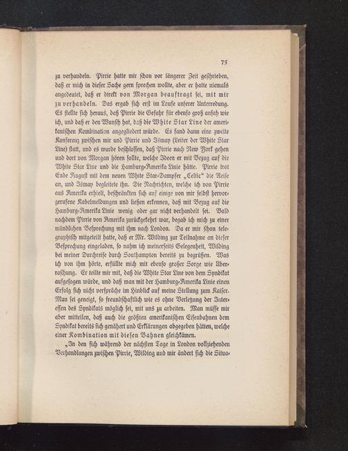 zu verhandeln. Pirrie hatte mir schon vor längerer Zeit geschrieben,daß er mich in dieser Lache gern sprechen wollte, aber er hatte niemalsangedeutet, daß er direkt von Morgan beauftragt sei, mit mirzu verhandeln. Das ergab sich erst im Laufe unserer Unterredung.Es stellte sich heraus, daß Pirrie die Gefahr für ebenso groß ansah wieich, und daß er den Wunsch hat, daß die White Star Line der ameri-kanischen Kombination angegliedert würde. Es fand dann eine zweiteKonferenz zwischen mir und Pirrie und Äsmay (Leiter der White StarLine ) statt, und es wurde beschlossen, daß Pirrie nach New Bork gehenund dort von Morgan hören sollte, welche Ädeen er mit Bezug auf dieWhite Star Line und die Hamburg-Amerika Linie hätte. Pirrie tratEnde August mit dem neuen White Star-Dampfer „Celtic" die Reisean, und Äsmay begleitete ihn. Die Nachrichten, welche ich von Pirrieaus Amerika erhielt, beschränkten sich auf einige von mir selbst hervor-gerufene Kabelmeldungen und ließen erkennen, daß mit Bezug auf dieHamburg-Amerika Linie wenig oder gar nicht verhandelt sei. Baldnachdem Pirrie von Amerika zurückgekehrt war, begab ich mich zu einermündlichen Besprechung mit ihm nach London . Da er mir schon tele-graphisch mitgeteilt hatte, daß er Mr. Wilding zur Teilnahme an dieserBesprechung eingeladen, so nahm ich meinerseits Gelegenheit, Wildingbei meiner Durchreise durch Louthampton bereits zu begrüßen. Wasich von ihm hörte, erfüllte mich mit ebenso großer Sorge wie Über-raschung. Er teilte mir mit, daß die White Star Line von dem Syndikataufgesogen würde, und daß man mit der Hamburg-Amerika Linie einenErfolg sich nicht verspräche im Hinblick auf meine Stellung zum Kaiser.Man sei geneigt, so freundschaftlich wie es ohne Verletzung der Inter-essen des Syndikats möglich sei, mit uns zu arbeiten. Man müsse miraber mitteilen, daß auch die größten amerikanischen Eisenbahnen demSyndikat bereits sich genähert und Erklärungen abgegeben hätten, welcheeiner Kombination mit diesen Bahnen gleichkämen.