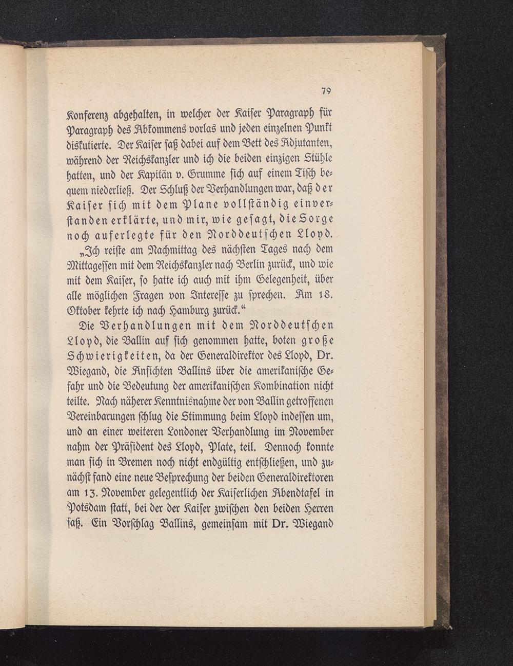 Konferenz abgehalten, in welcher der Kaiser Paragraph fürParagraph des Abkommens vorlas und jeden einzelnen Punktdiskutierte. Der Kaiser saß dabei auf dem Bett des Adjutanten,während der Reichskanzler und ich die beiden einzigen Stühlehatten, und der Kapitän v. Grumme sich auf einem Tisch be-quem niederließ. Der Schluß der Verhandlungen war, daß d e rKaiser sich mit dem Plane vollständig einver-standen erklärte, und mir, wie gesagt, dieSorgenoch auferlegte für den Norddeutschen Lloyd.