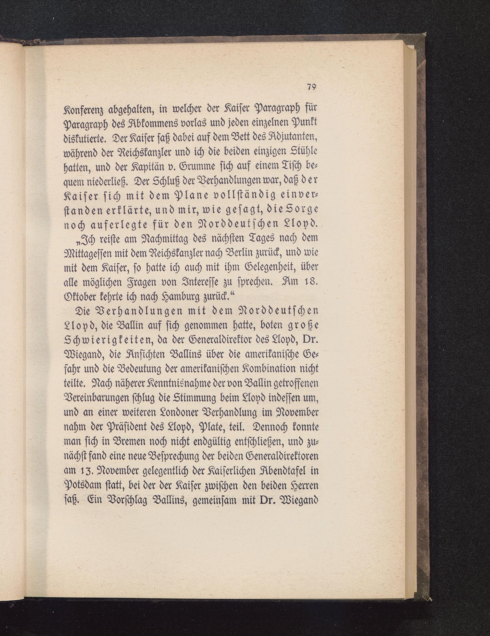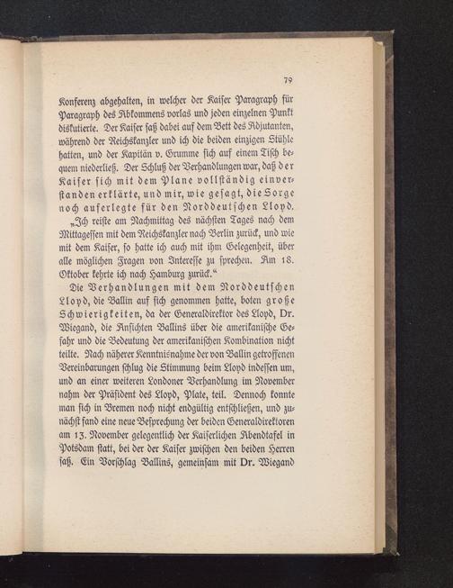 »Ich reiste am Nachmittag des nächsten Tages nach demMittagessen mit dem Reichskanzler nach Berlin zurück, und wiemit dem Kaiser, so hatte ich auch mit ihm Gelegenheit, überalle möglichen Fragen von Interesse zu sprechen. Am 18.Oktober kehrte ich nach Hamburg zurück/
