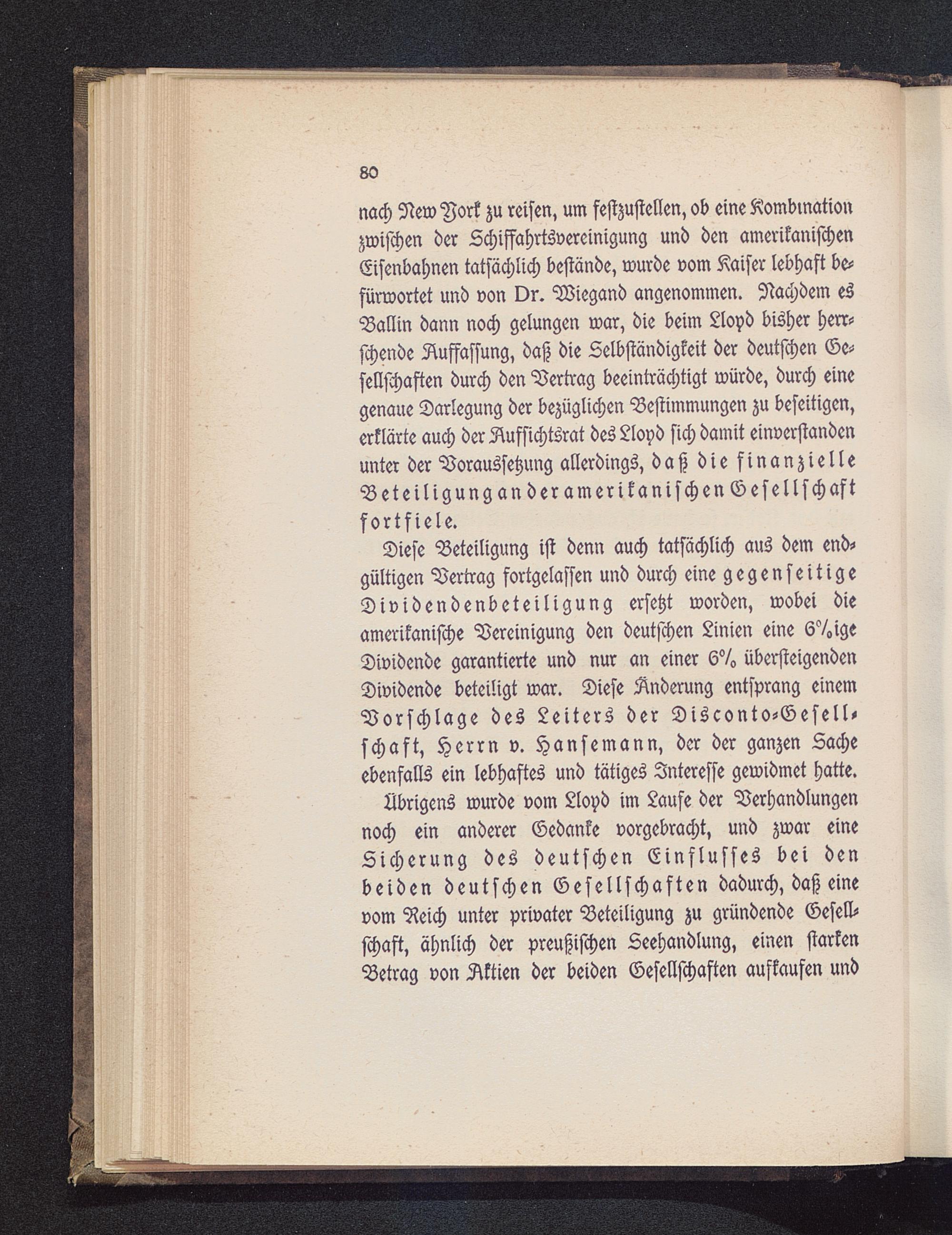 Diese Beteiligung ist denn auch tatsächlich aus dem end-gültigen Vertrag fortgelassen und durch eine gegenseitigeDividendenbeteiligung ersetzt worden, wobei dieamerikanische Vereinigung den deutschen Linien eine 6°/,igeDividende garantierte und nur an einer 6°/« übersteigendenDividende beteiligt war. Diese Änderung entsprang einemVorschlage des Leiters der Disconto-Gesell,schafft Herrn v. Hansemann, der der ganzen Lacheebenfalls ein lebhaftes und tätiges Interesse gewidmet hatte.