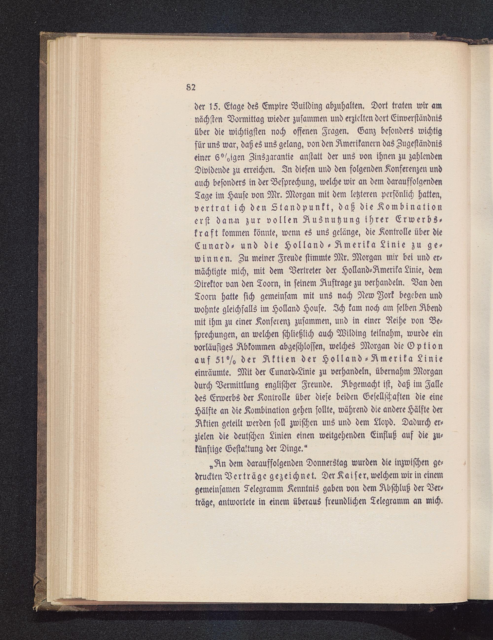 der 1Z. Etage des Empire Building abzuhalten. Dort traten wir amnächsten Vormittag wieder zusammen und erzielten dort Einverständnisüber die wichtigsten noch offenen Fragen. Ganz besonders wichtigfür uns war, daß es uns gelang, von den Amerikanern das Zugeständniseiner ewigen Jinsgarantie anstatt der uns von ihnen zu zahlendenDividende zu erreichen. 2n diesen und den folgenden Konferenzen undauch besonders in der Besprechung, welche wir an dem darauffolgendenTage im Hause von Mr. Morgan mit dem letzteren persönlich hatten,vertrat ich den Standpunkt, daß dieKombinationerst dan-n zur vollen Ausnutzung ihrer Erwerbs-kraft kommen könnte, wenn es uns gelänge, die Kontrolle über dieCunard- und die Holland - Amerika Linie zu ge-winnen. Zu meiner Freude stimmte Mr. Morgan mir bei und er-mächtigte mich, mit dem Vertreter der Holland-Amerika Linie, demDirektor van den Toorn, in seinem Auftrage zu verhandeln. Van denToorn hatte sich gemeinsam mit uns nach New Aork begeben undwohnte gleichfalls im Holland House. Ich kam noch am selben Abendmit ihm zu einer Konferenz zusammen, und in einer Reihe von Be-sprechungen, an welchen schließlich auch Wilding teilnahm, wurde einvorläufiges Abkommen abgeschlossen, welches Morgan die Gptionauf Z1°/<> der Aktien der Holland-Amerika Linieeinräumte. Mit der Cunard-Linie zu verhandeln, übernahm Morgandurch Vermittlung englischer Freunde. Abgemacht ist, daß im Falledes Erwerbs der Kontrolle über diese beiden Gesellschaften die eineHälfte an die Kombination gehen sollte, während die andere Hälfte derAktien geteilt werden soll zwischen uns und dem Llopd. Dadurch er-zielen die deutschen Linien einen weitgehenden Einfluß auf die zu-künftige Gestaltung der Dinge."