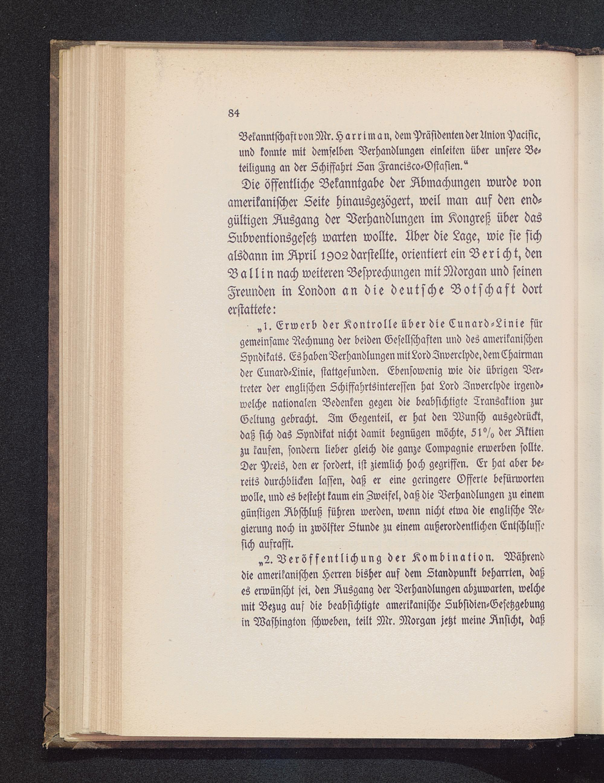 Die öffentliche Bekanntgabe der Abmachungen wurde vonamerikanischer Leite hinausgezögert, weil man auf den end-gültigen Ausgang der Verhandlungen im Kongreß über dasLubventionsgesetz warten wollte. Aber die Lage, wie sie sichalsdann im April 1902 darstellte, orientiert einBericht, denBallin nach weiteren Besprechungen mit Morgan und seinenFreunden in London an die deutsche Botschaft dorterstattete: