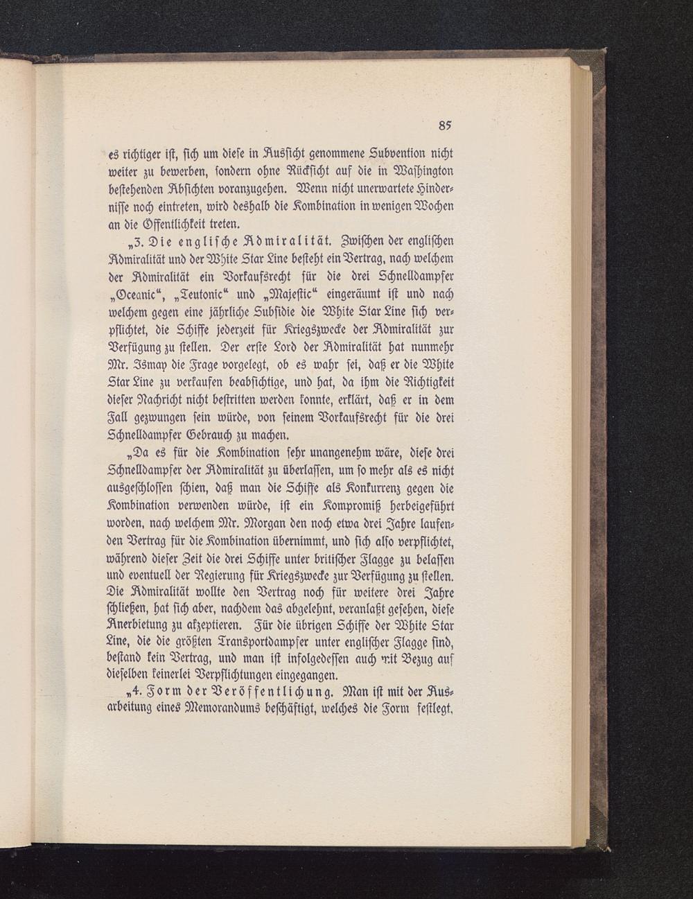 „Da es für die Kombination sehr unangenehm wäre, diese dreiSchnelldampfer der Admiralität zu überlassen, um so mehr als es nichtausgeschlossen schien, daß man die Schiffe als Konkurrenz gegen dieKombination verwenden würde, ist ein Kompromiß herbeigeführtworden, nach welchem Mr. Morgan den noch etwa drei Jahre lausen-den Vertrag für die Kombination übernimmt, und sich also verpflichtet,während dieser Zeit die drei Schiffe unter britischer Flagge zu belassenund eventuell der Regierung für Kriegszwecke zur Verfügung zu stellen.Die Admiralität wollte den Vertrag noch für weitere drei Jahreschließen, hat sich aber, nachdem das abgelehnt, veranlaßt gesehen, dieseAnerbietung zu akzeptieren. Für die übrigen Schiffe der White StarLine, die die größten Transportdampfer unter englischer Flagge sind,bestand kein Vertrag, und man ist infolgedessen auch mit Bezug aufdieselben keinerlei Verpflichtungen eingegangen.