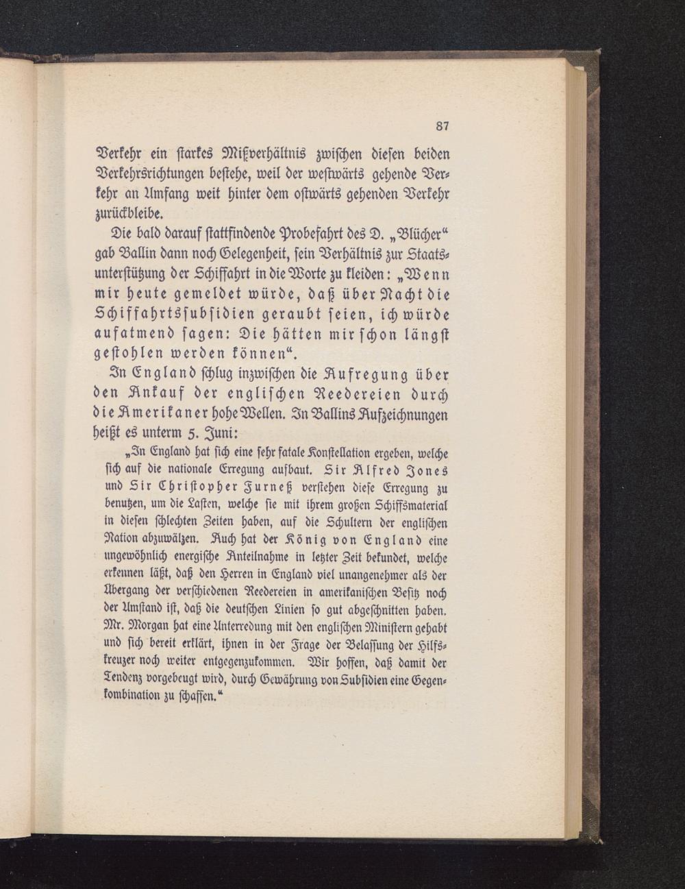 In England schlug inzwischen die Aufregung überden Ankauf der englischen Reedereien durchdieAmerikaner hohe Wellen. In Ballins Aufzeichnungenheißt es unterm 5. Juni: