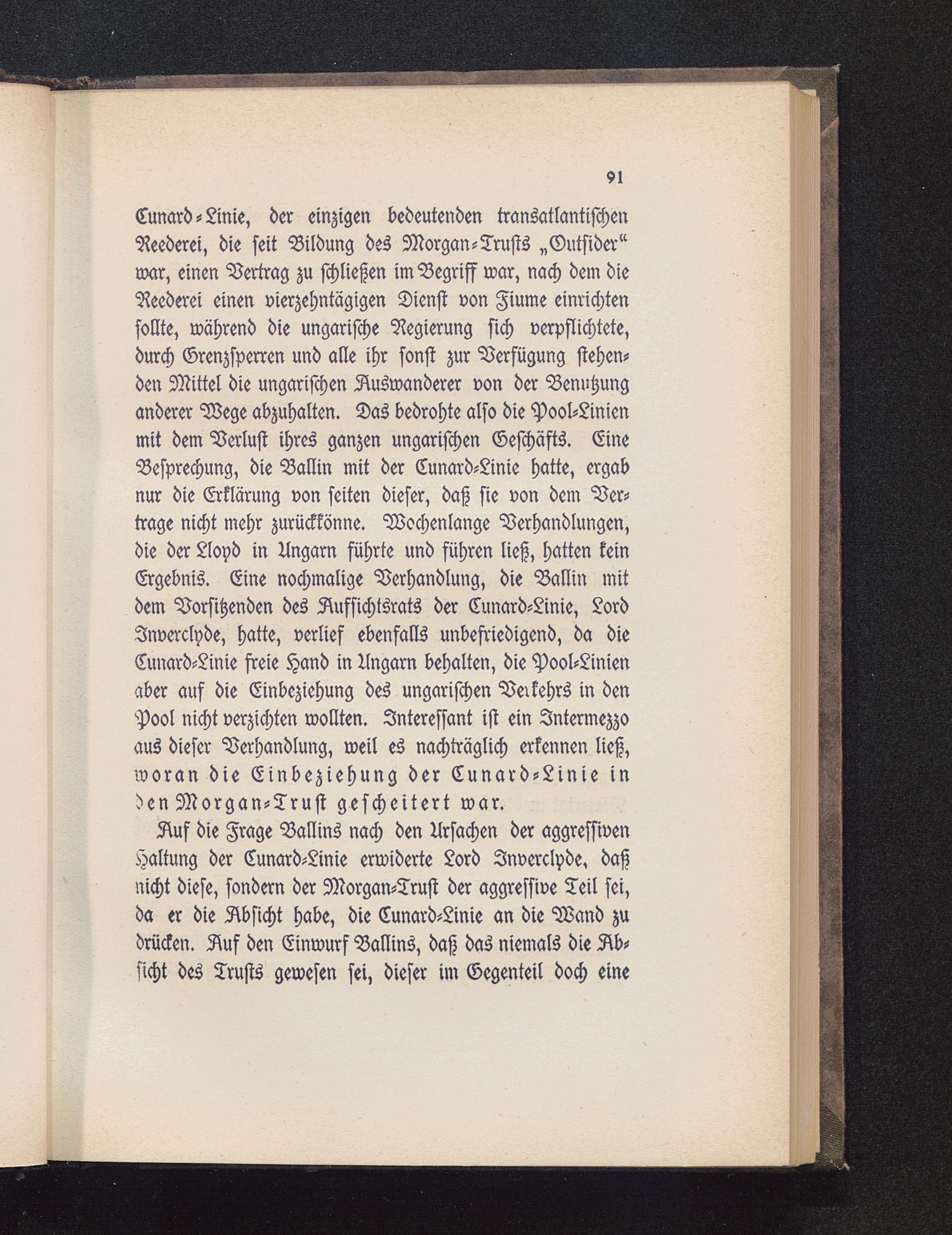 Cunard-Linie, der einzigen bedeutenden transatlantischenReederei, die seit Bildung des Morgan-Trusts „(Outsider«war, einen Vertrag zu schließen im Begriff war, nach dem dieReederei einen vierzehntägigen Dienst von Fiume einrichtensollte, während die ungarische Regierung sich verpflichtete,durch Grenzsperren und alle ihr sonst zur Verfügung stehen-den Mittel die ungarischen Auswanderer von der Benutzunganderer Wege abzuhalten. Das bedrohte also die Pool-Linienmit dem Verlust ihres ganzen ungarischen Geschäfts. EineBesprechung, die Ballin mit der Cunard-Linie hatte, ergabnur die Erklärung von feiten dieser, daß sie von dem Ver-trage nicht mehr zurückkönne. Wochenlange Verhandlungen,die der Lloyd in Ungarn führte und führen ließ, hatten keinErgebnis. Eine nochmalige Verhandlung, die Ballin mitdem Vorsitzenden des Aufsichtsrats der Cunard-Linie, LordJnverclyde, hatte, verlief ebenfalls unbefriedigend, da dieCunard-Linie freie Hand in Ungarn behalten, die Pool-Linienaber auf die Einbeziehung des ungarischen Verkehrs in denPool nicht verzichten wollten. Interessant ist ein Intermezzoaus dieser Verhandlung, weil es nachträglich erkennen ließ,woran die Einbeziehung der Cunard-Linie inden Morgan-Trust gescheitert war.