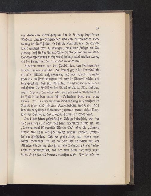 Alsdann wurde von den Pool-Linien, den kontinentalensowohl wie den englischen, der Kampf gegen die Cunard-Liniemit allen Mitteln aufgenommen, und zwar sowohl im engli-schen wie im skandinavischen und auch im Fiume-Verkehr, mitdem Ergebnis, daß sich allmählich Ausgleichsverhandlungenanbahnten. Der Präsident des Board ofTrade, Mr. Balfour,ergriff dazu die Initiative, aber eine zweimalige Verhandlungim Juli in London unter seiner Teilnahme blieb noch ohneErfolg. Erst in einer weiteren Verhandlung in Frankfurt imAugust 1904 fand sich eine Vergleichsbasis, und Ende 1904kam ein endgültiges Abkommen zustande, womit dieses Nach-spiel der Gründung des Morgan-Trusts sein Ende fand.