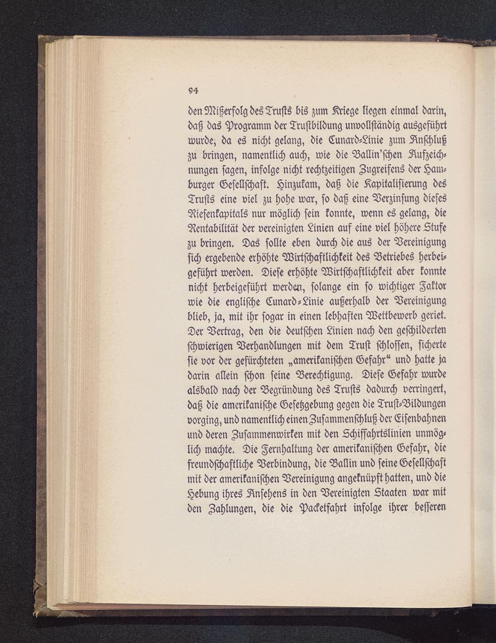 den Mißerfolg des Trusts bis zum Kriege liegen einmal darin,daß das Programm der Trustbildung unvollständig ausgeführtwurde, da es nicht gelang, die Cunard-Linie zum Anschlußzu bringen, namentlich auch, wie die Ballin'schen Aufzeich-nungen sagen, infolge nicht rechtzeitigen Zugreifens der Ham-burger Gesellschaft. Hinzukam, daß die Kapitalisierung desTrusts eine viel zu hohe war, so daß eine Verzinsung diesesRiesenkapitals nur möglich sein konnte, wenn es gelang, dieRentabilität der vereinigten Linien auf eine viel höhere Stufezu bringen. Das sollte eben durch die aus der Vereinigungsich ergebende erhöhte Wirtschaftlichkeit des Betriebes herbei-geführt werden. Diese erhöhte Wirtschaftlichkeit aber konntenicht herbeigeführt werden, solange ein so wichtiger Faktorwie die englische Cunard-Linie außerhalb der Vereinigungblieb, ja, mit ihr sogar in einen lebhaften Wettbewerb geriet.Der Vertrag, den die deutschen Linien nach den geschildertenschwierigen Verhandlungen mit dem Trust schloffen, sichertesie vor der gefürchteten »amerikanischen Gefahr" und hatte jadarin allein schon seine Berechtigung. Diese Gefahr wurdealsbald nach der Begründung des Trusts dadurch verringert,daß die amerikanische Gesetzgebung gegen die Trust-Bildungenvorging, und namentlich einen Zusammenschluß der Eisenbahnenund deren Zusammenwirken mit den Schiffahrtslinien unmög-lich machte. Die Fernhaltung der amerikanischen Gefahr, diefreundschaftliche Verbindung, die Ballin und seine Gesellschaftmit der amerikanischen Vereinigung angeknüpft hatten, und dieHebung ihres Ansehens in den Vereinigten Staaten war mitden Zahlungen, die die Packetfahrt infolge ihrer besseren