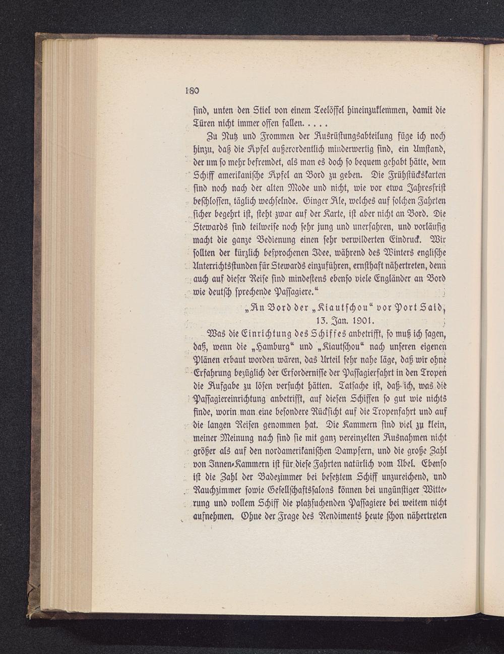 Zu Nutz und Frommen der Ausrüstungsabteilung füge ich nochhinzu, daß die Apfel außerordentlich minderwertig sind, ein Umstand,der um so mehr befremdet, als man es doch so bequem gehabt hätte, dem'Schiff amerikanische Apfel an Bord zu geben. Die Zrühsiückskartensind noch nach der alten Mode und nicht, wie vor etwa Jahresfristbeschlossen, täglich wechselnde. Singer Äle, welches auf solchen Fahrtensicher begehrt ist, steht zwar auf der Karte, ist aber nicht an Bord. DieStewards sind teilweise noch sehr jung und unerfahren, und vorläufigmacht die ganze Bedienung einen sehr verwilderten Eindruck. Wirsollten der kürzlich besprochenen Idee, während des Winters englischeUnterrichtsstunden für Stewards einzuführen, ernsthaft nähertreten, dennauch auf dieser Reise sind mindestens ebenso viele Engländer an Bord- wie deutsch sprechende Passagiere/ -