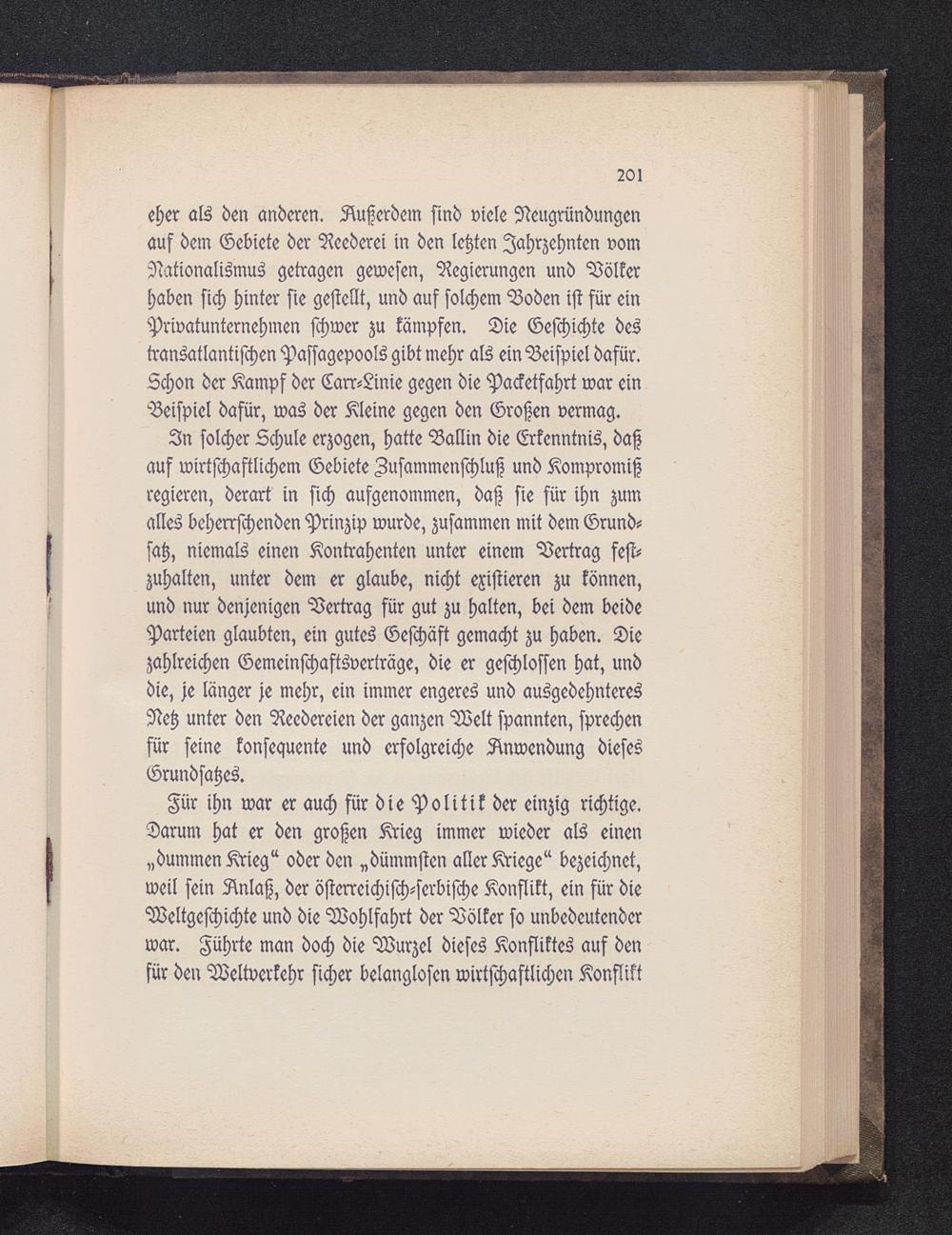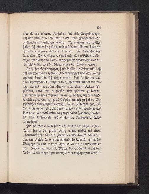 Für ihn war er auch für die Politik der einzig richtige.Darum hat er den großen Krieg immer wieder als einen„dummen Krieg" oder den „dümmsten aller Kriege" bezeichnet,weil sein Anlaß, der österreichisch-serbische Konflikt, ein für dieWeltgeschichte und die Wohlfahrt der Völker so unbedeutenderwar. Führte man doch die Wurzel dieses Konfliktes auf denfür den Weltverkehr sicher belanglosen wirtschaftlichen Konflikt